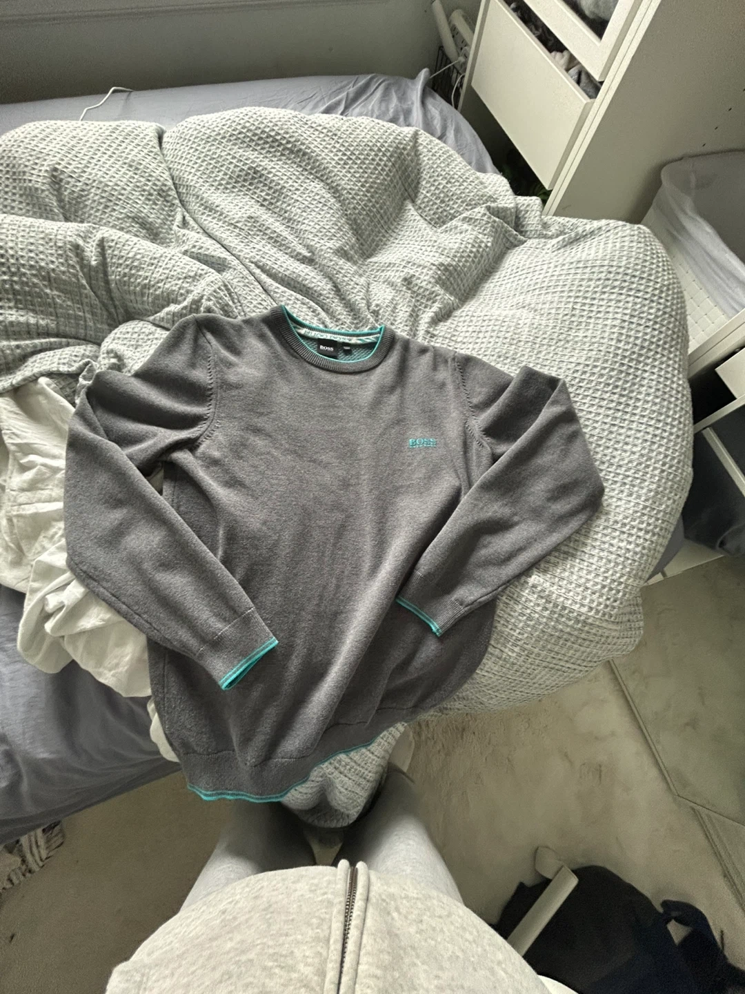 Grey Hugo Boss crewneck sweater. Features turquoise detailing on the collar and cuffs. Made in Tunisia. Perfect for a smart casual look!