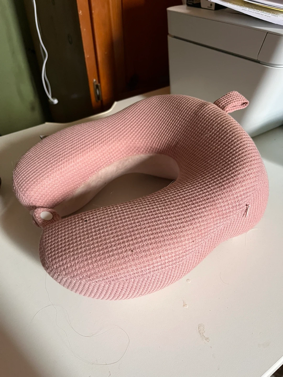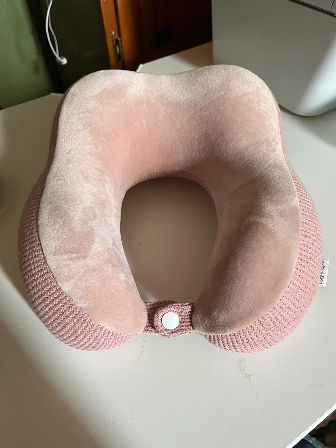 This pink travel neck pillow offers comfortable support. It's made with a soft, textured outer fabric and a plush interior. The pillow has a snap closure for secure fastening.