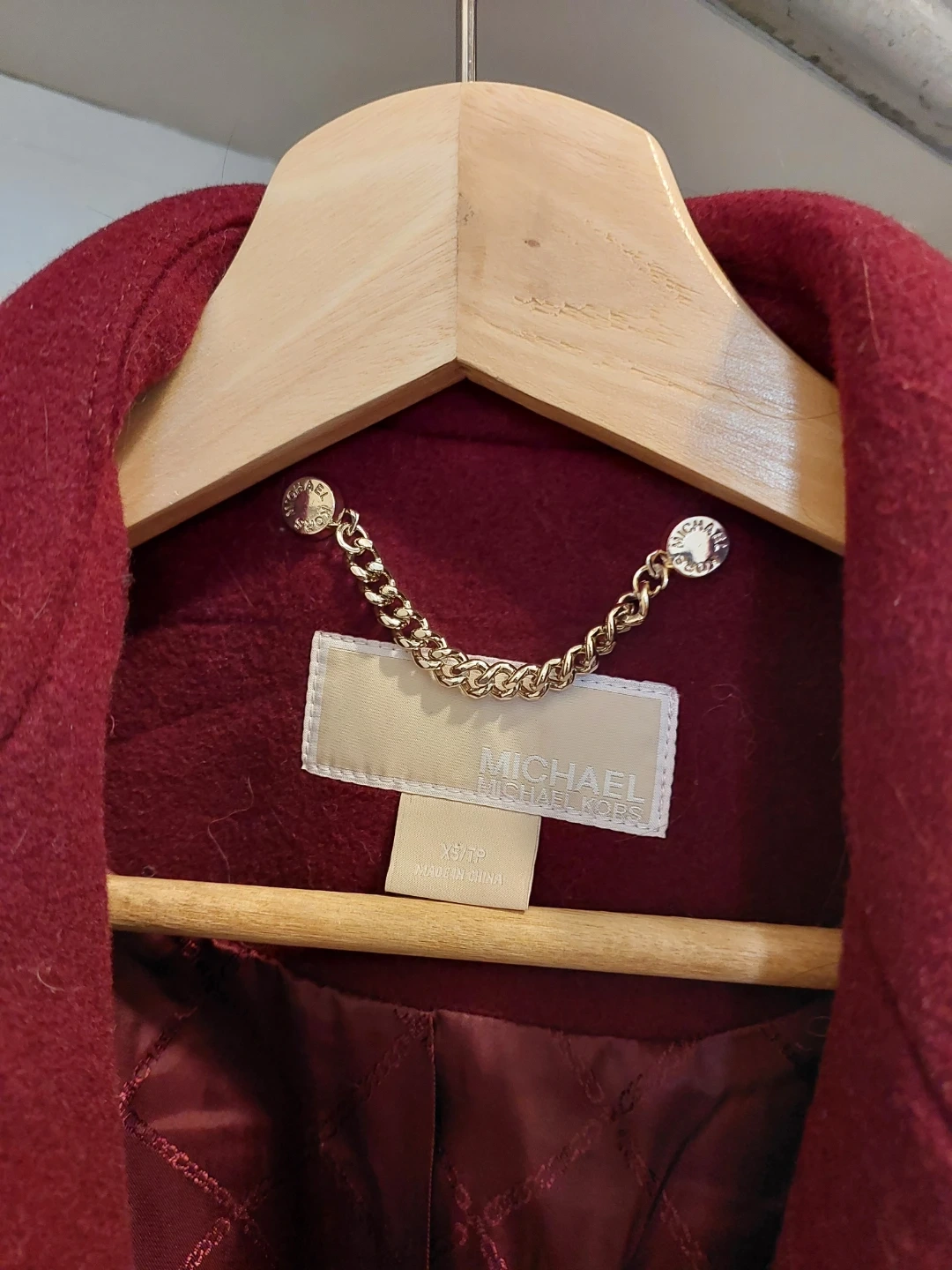 Michael Kors burgundy wool blend coat. Includes a chain detail and zip-up front. Size XS/TP.