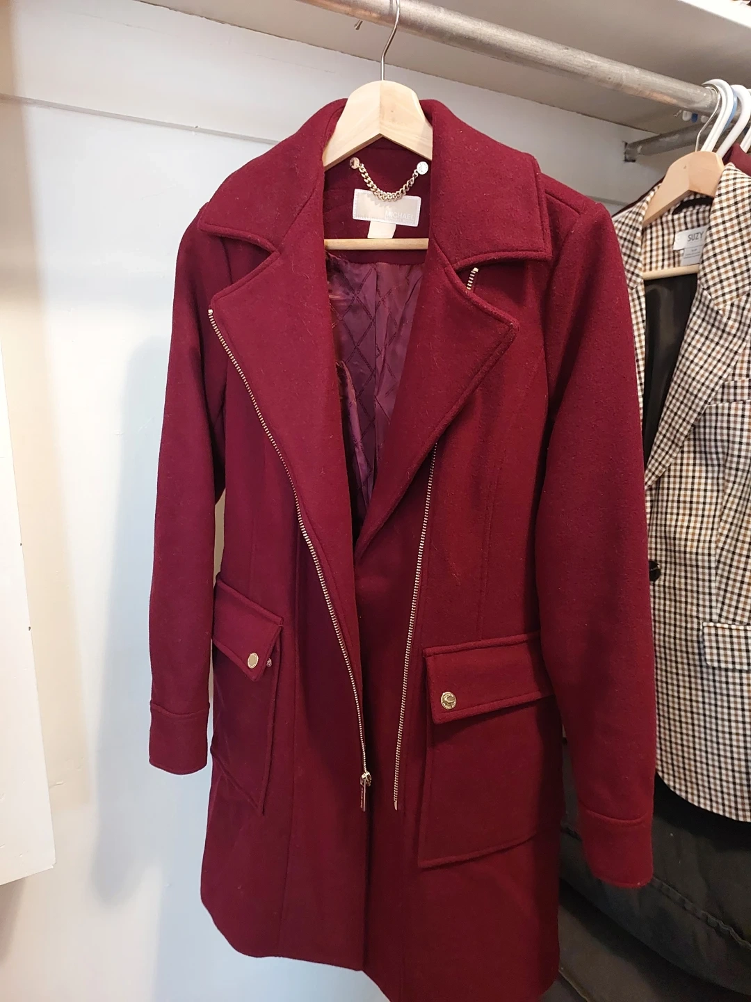 Michael Kors burgundy wool blend coat. Includes a chain detail and zip-up front. Size XS/TP.