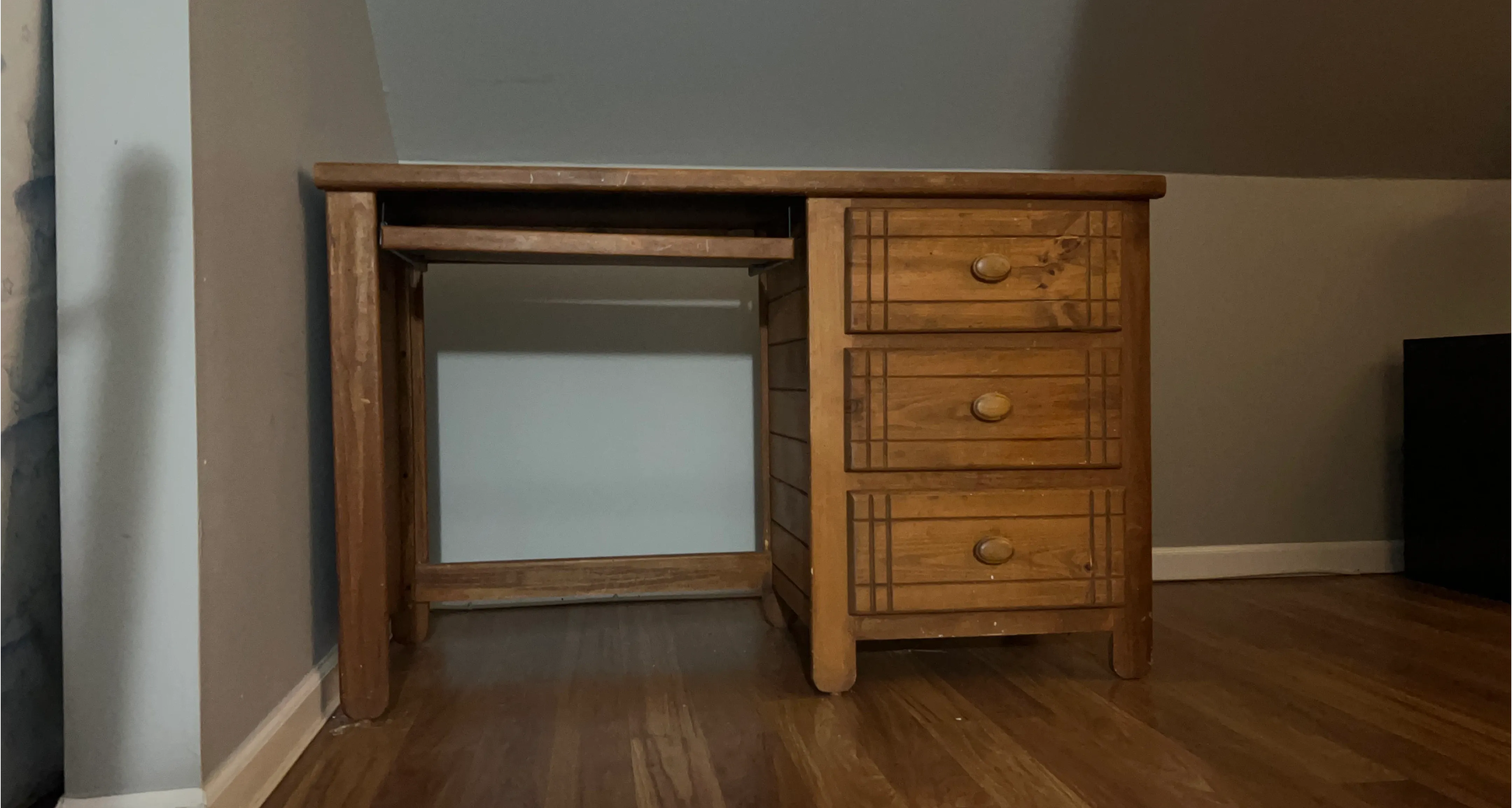 Selling a wooden desk with drawers. It features a pull-out keyboard tray and three drawers on the right side. It's a sturdy piece of furniture, perfect for a home office or study area. 30 inches wide by 48 inches long.