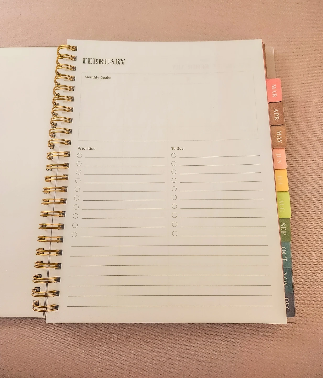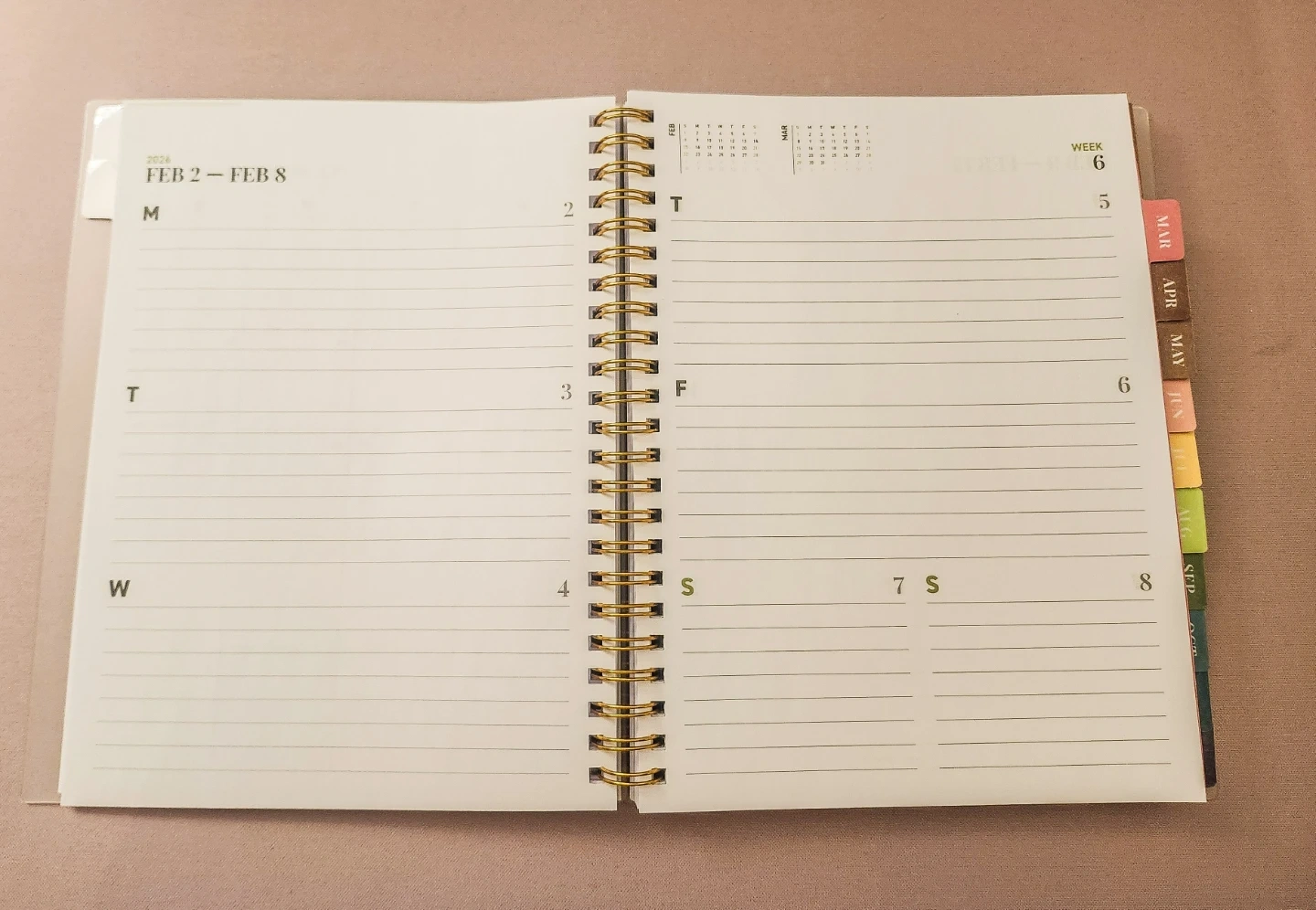 This is a 2026 annual planner. It features monthly, weekly, and notes sections. The planner runs from January 2026 to December 2026. Januarys calendar is missing. But February to December is all new and intact. It's wire-bound with tabbed dividers for easy navigation.