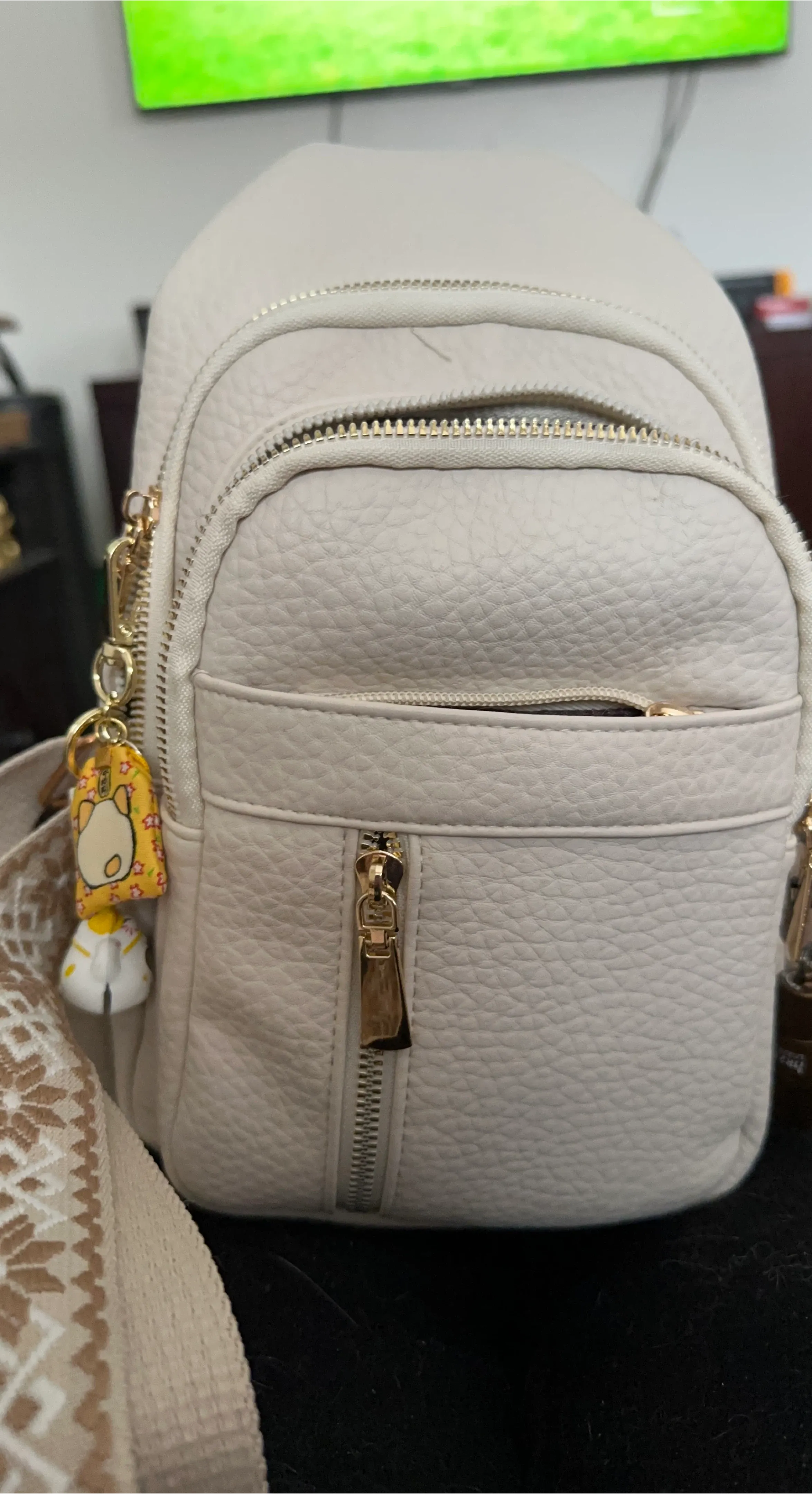 Cute white mini backpack in great condition! It's made of a textured leather-like material and features gold-tone zippers. Perfect for carrying essentials on the go