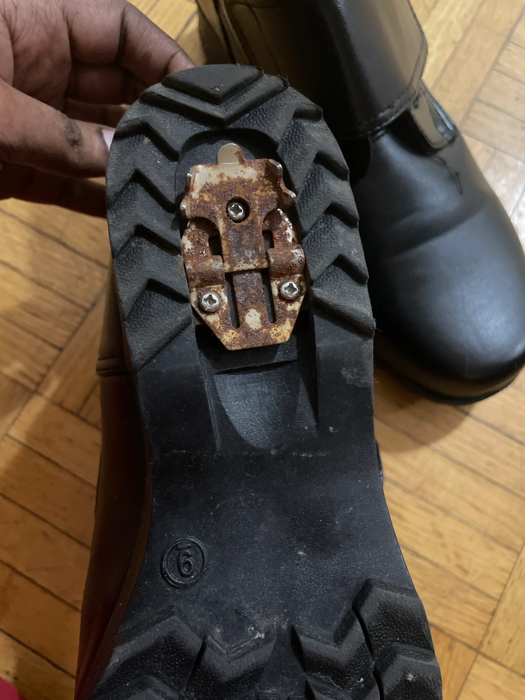 Comfortable black boots lined with soft faux fur for warmth. They feature adjustable velcro straps for an easy fit. The sole has a textured grip. Size 6 is indicated on the sole.
