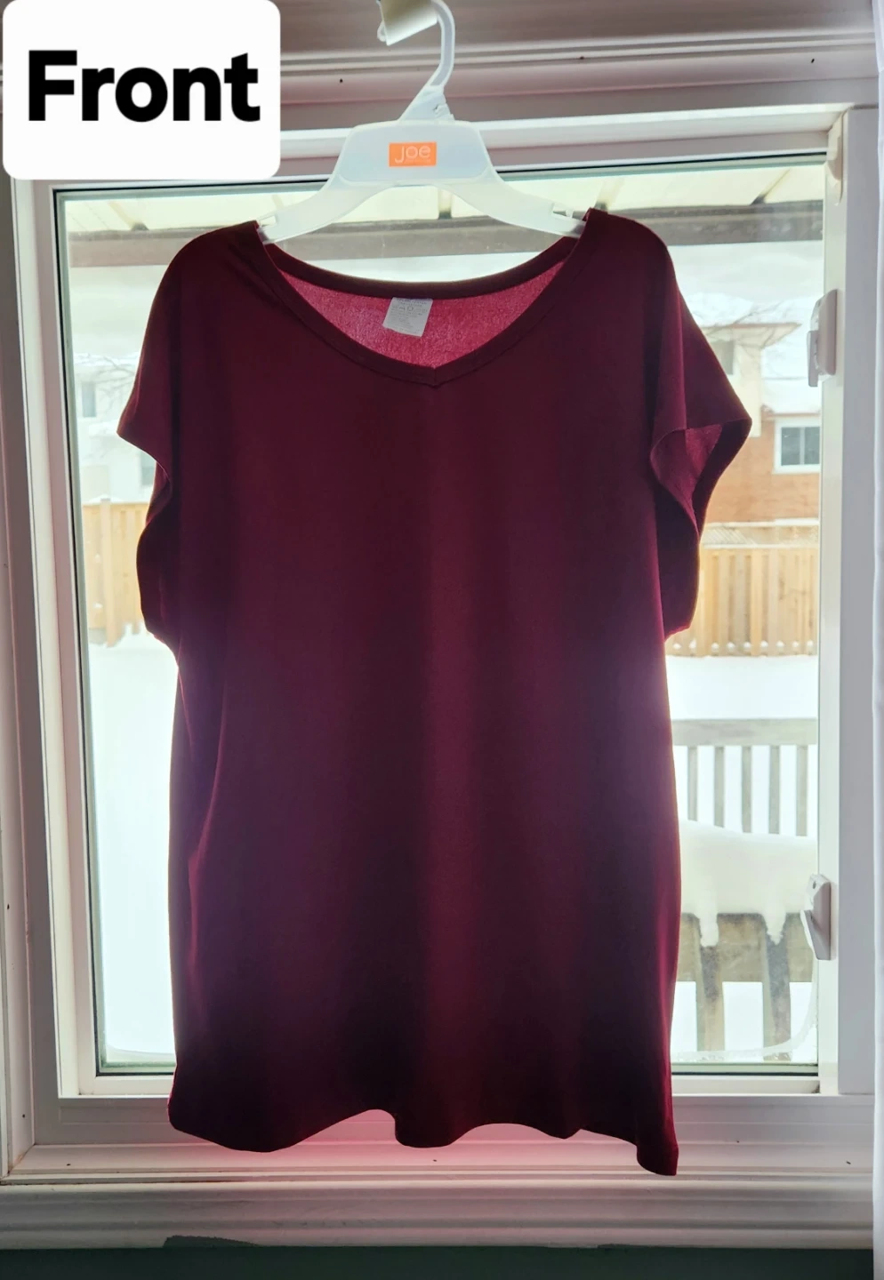 New, never worn, ladies size large, V neck, maroon or wine coloured T-shirt.