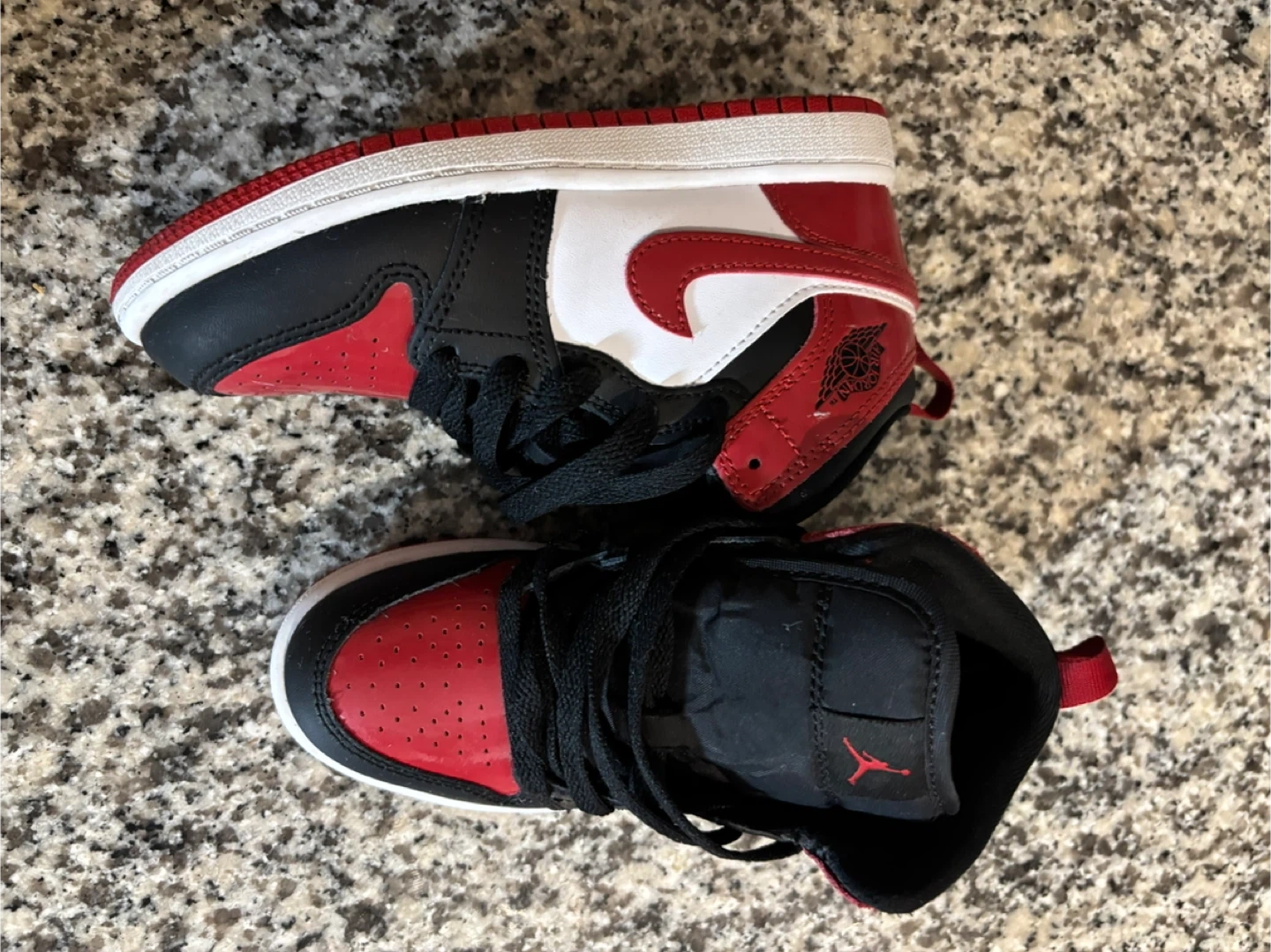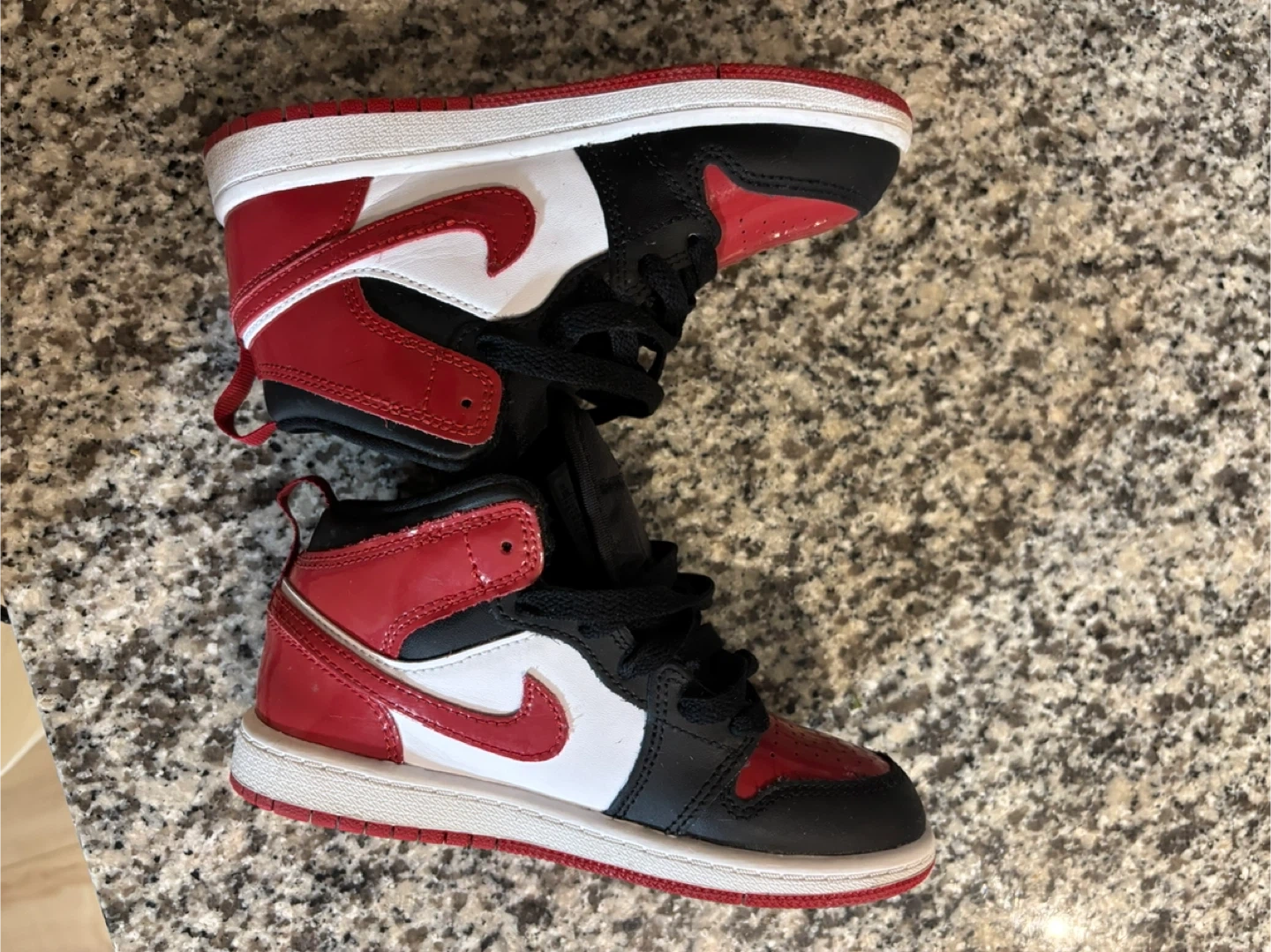 These kids' Air Jordan 1 High OG shoes feature the classic "Bred Toe" colourway. They're made with a mix of leather and synthetic materials. Perfect for little sneakerheads! Size13 c