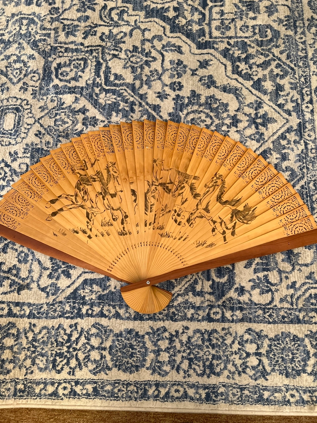 Beautiful big vintage hand fan. Features a unique design of horses. Wooden frame and slats. Intricate detailing. Wall mountable.