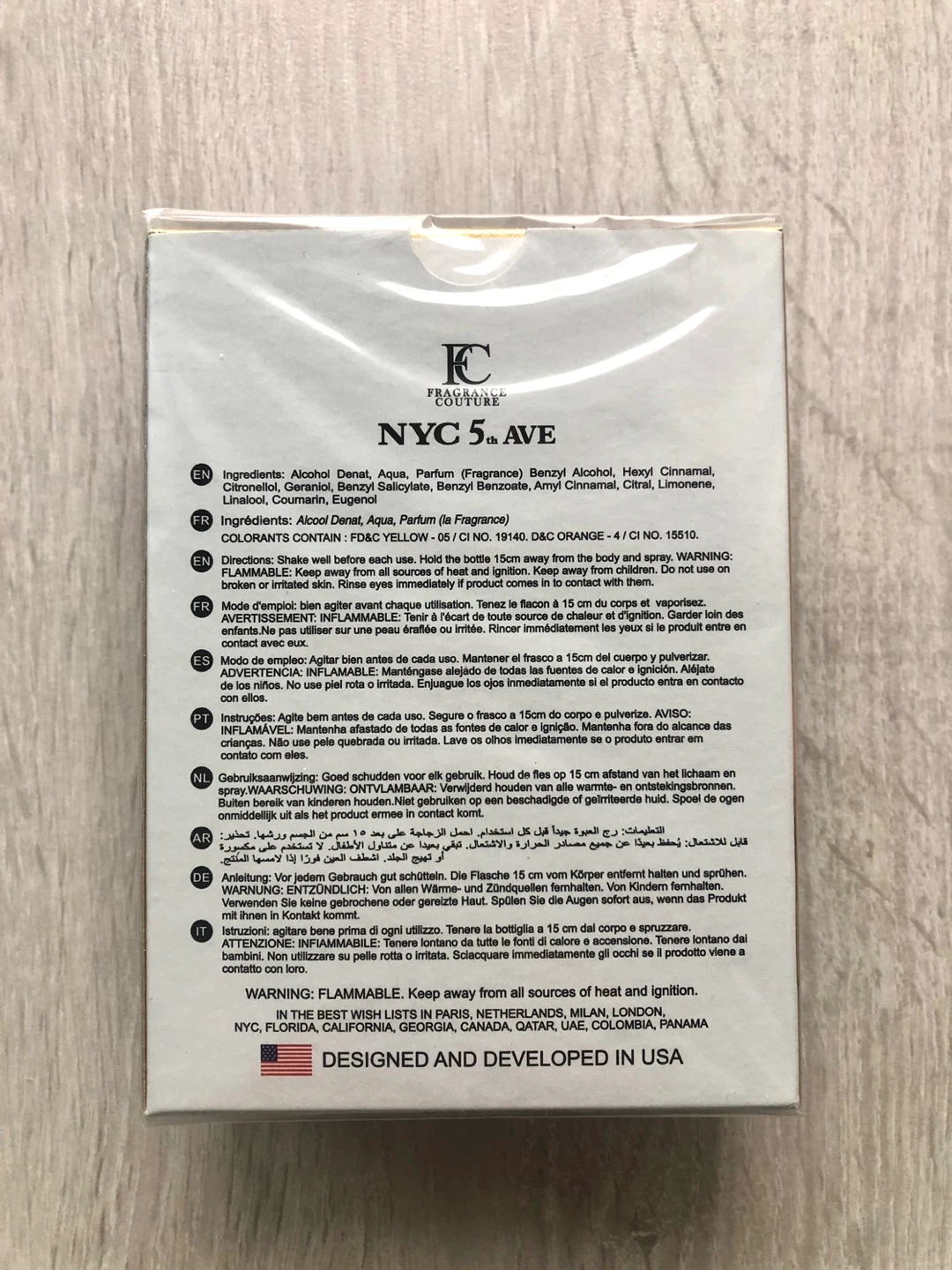 This is NYC 5th Ave Eau de Parfum for women. It's a natural spray. The bottle contains 100ml or 3.4 fl. oz. This fragrance is designed and developed in the USA.