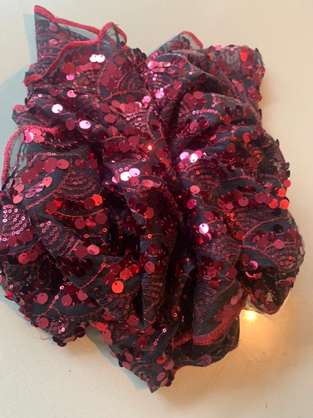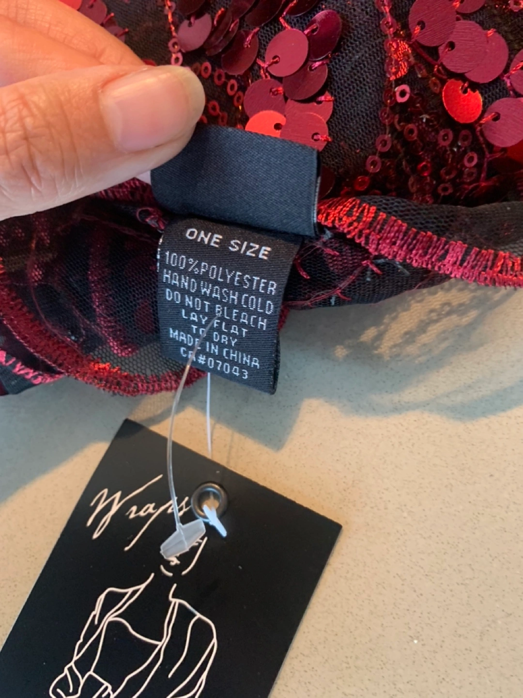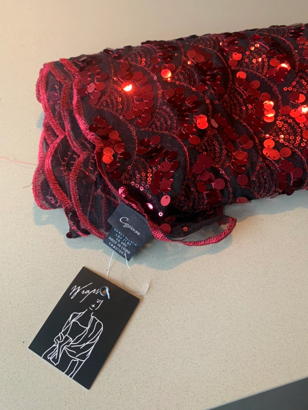 Red sequin fabric with scalloped edges. Measures approximately 73 inches long and 20 inches wide. This is brand new with tags. Made as a shoulder wrap but I purchased it to use as a Holiday table runner but never used.