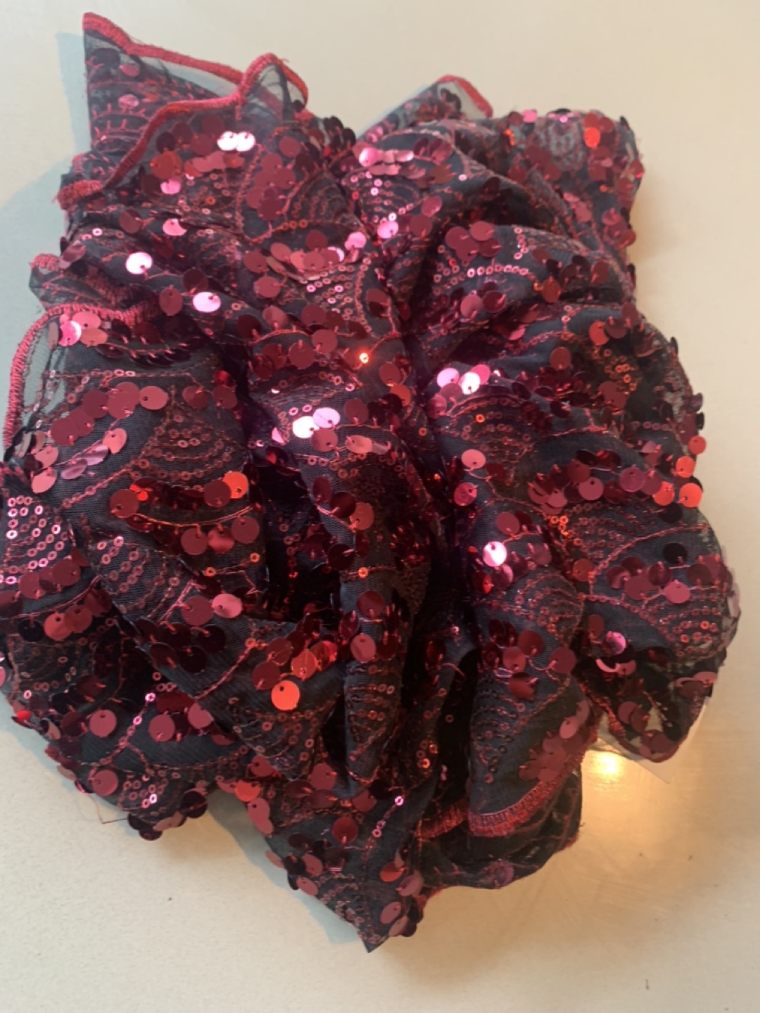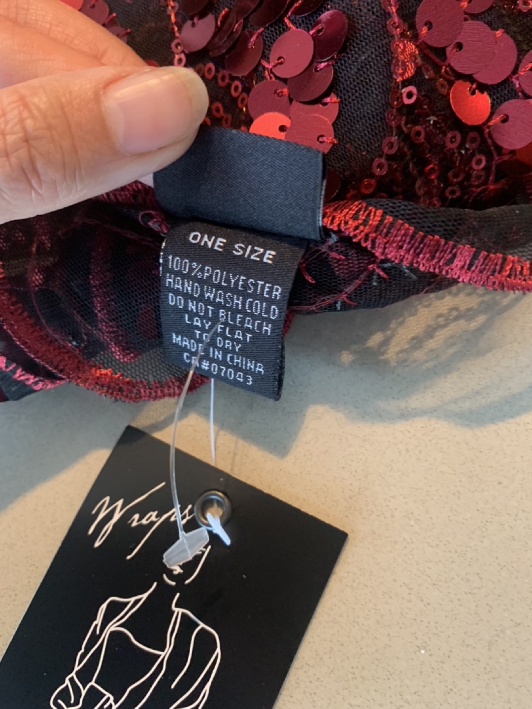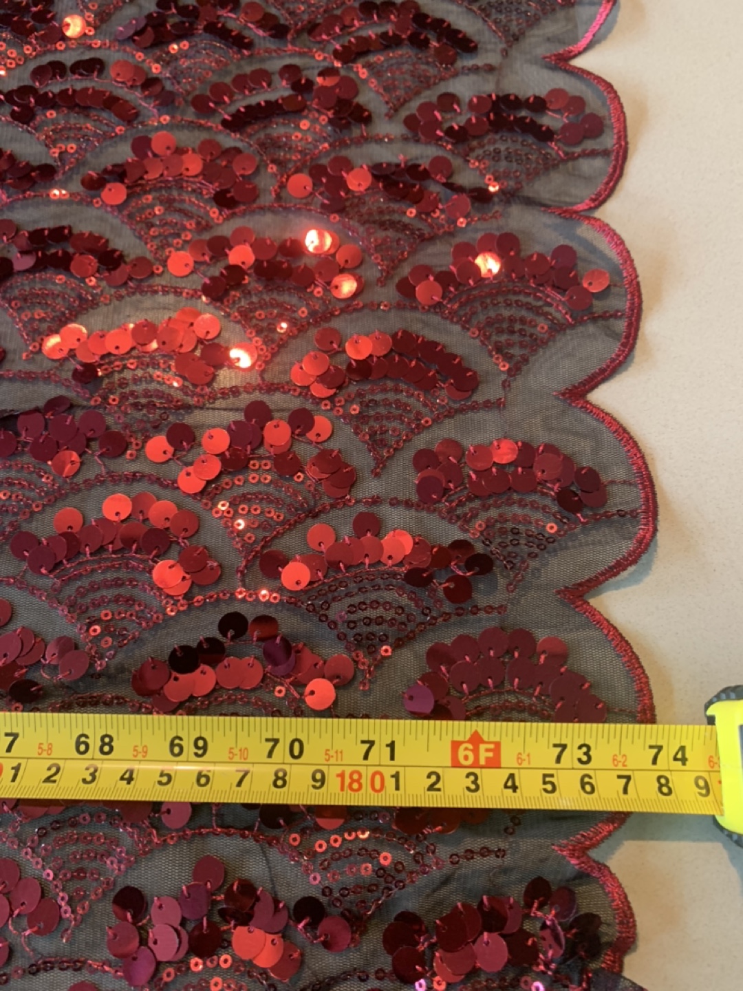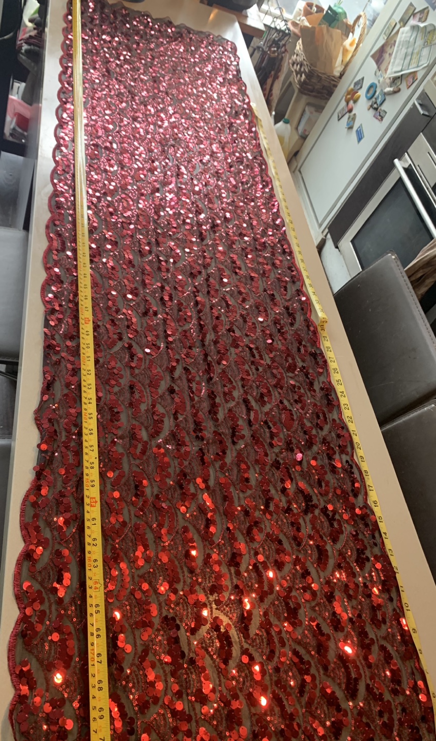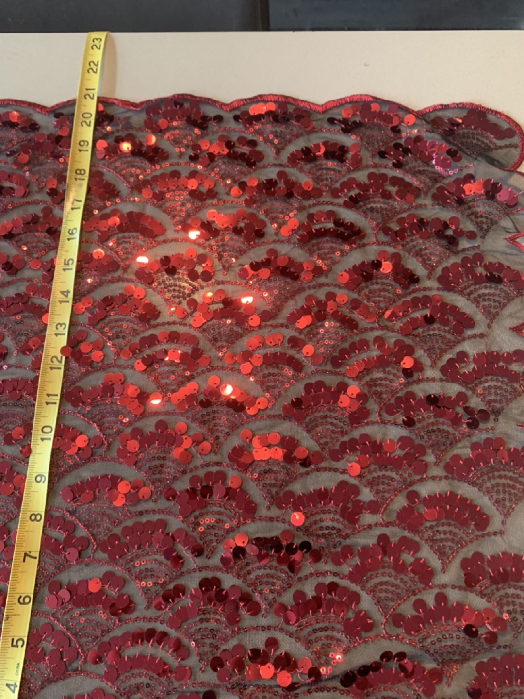 Red sequin fabric with scalloped edges. Measures approximately 73 inches long and 20 inches wide. This is brand new with tags. Made as a shoulder wrap but I purchased it to use as a Holiday table runner but never used.
