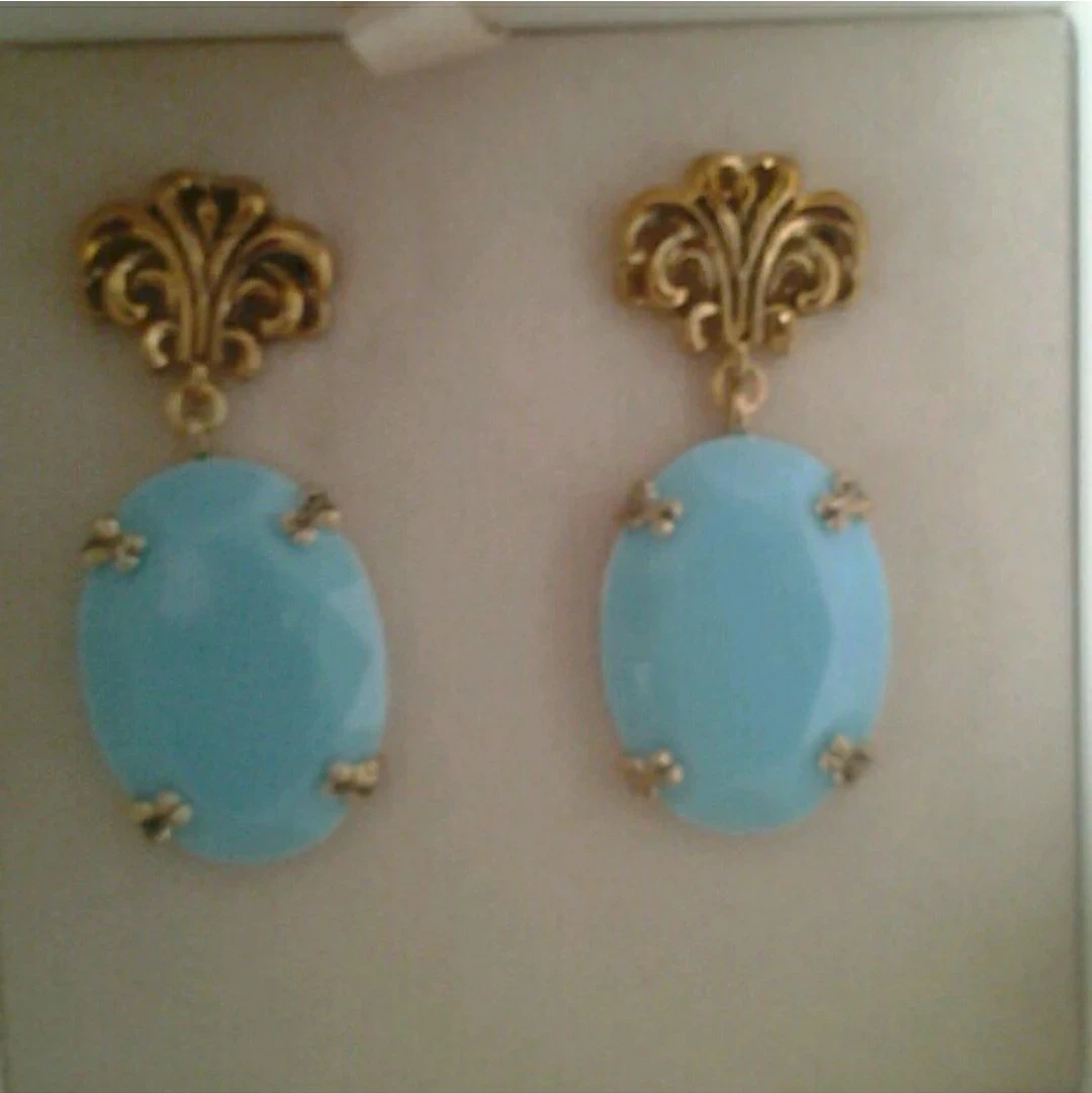 These elegant earrings feature oval-cut turquoise stones set in goldtone metal. The decorative filigree tops add a vintage flair. They're perfect for adding a pop of color to any outfit!