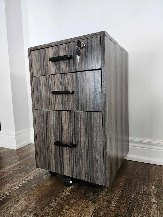 This new three drawer rolling file cabinet is perfect for any office! It's in great condition and features a lock on the top drawer to keep your important documents safe and secure. It has three drawers for ample storage and rolling casters for easy mobility. The top drawer has a lock for security. Let me know if you're interested!