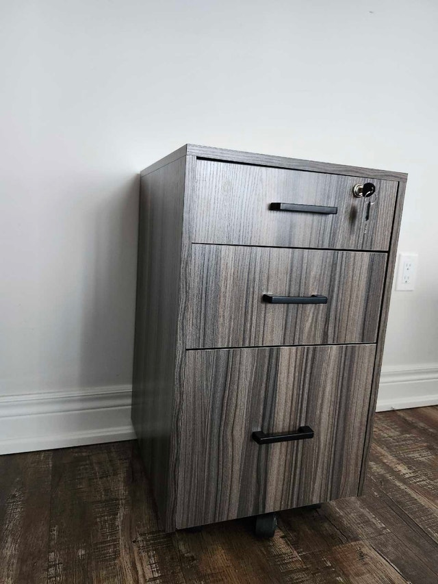 This new three drawer rolling file cabinet is perfect for any office! It's in great condition and features a lock on the top drawer to keep your important documents safe and secure. It has three drawers for ample storage and rolling casters for easy mobility. The top drawer has a lock for security. Let me know if you're interested!