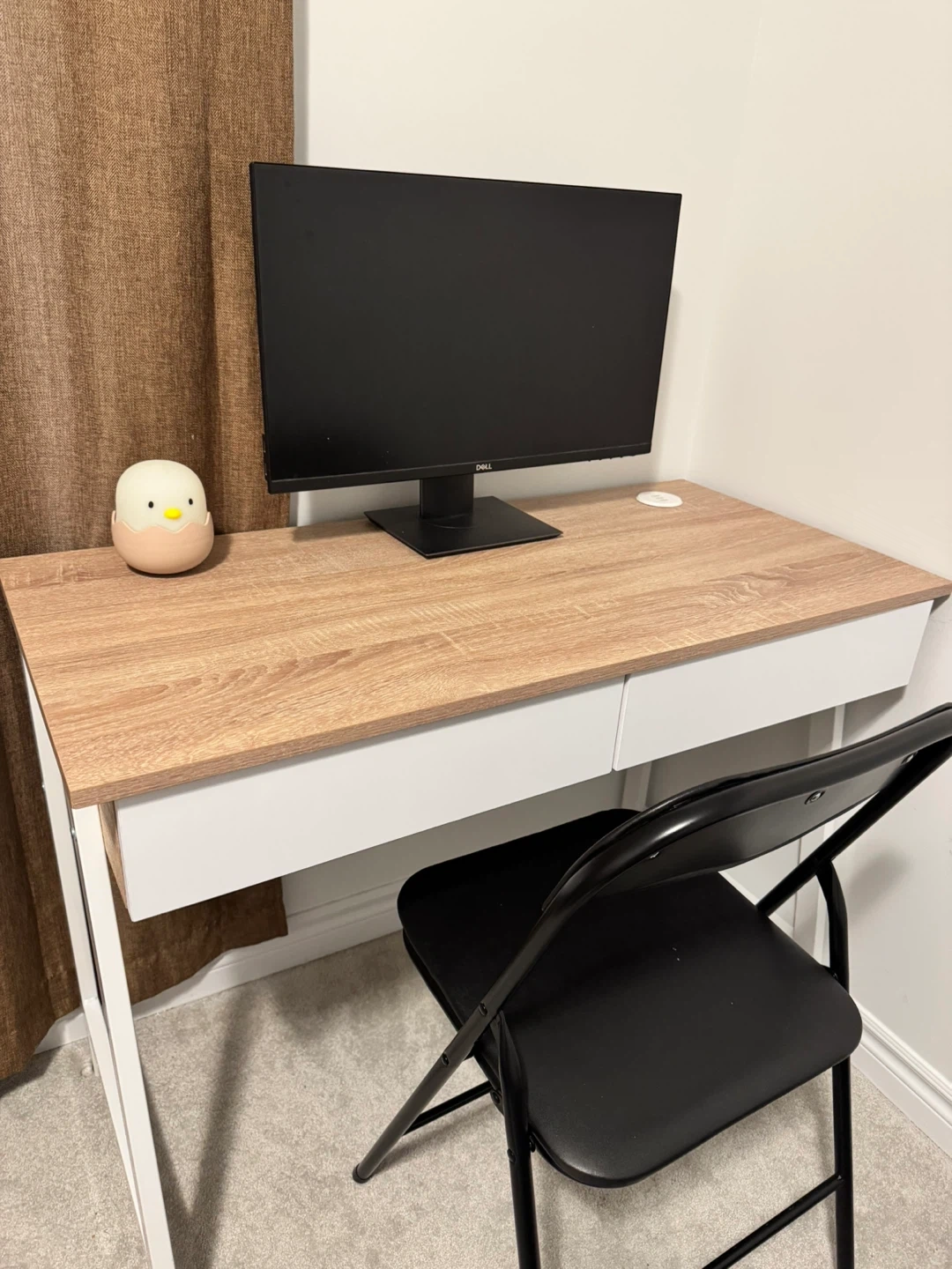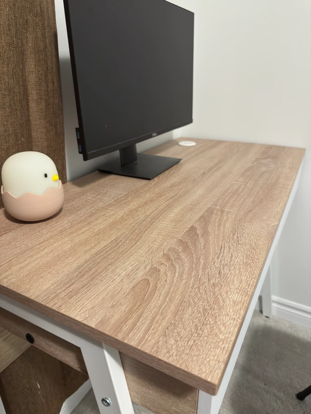 This desk has a light wood grain top and two white drawers.