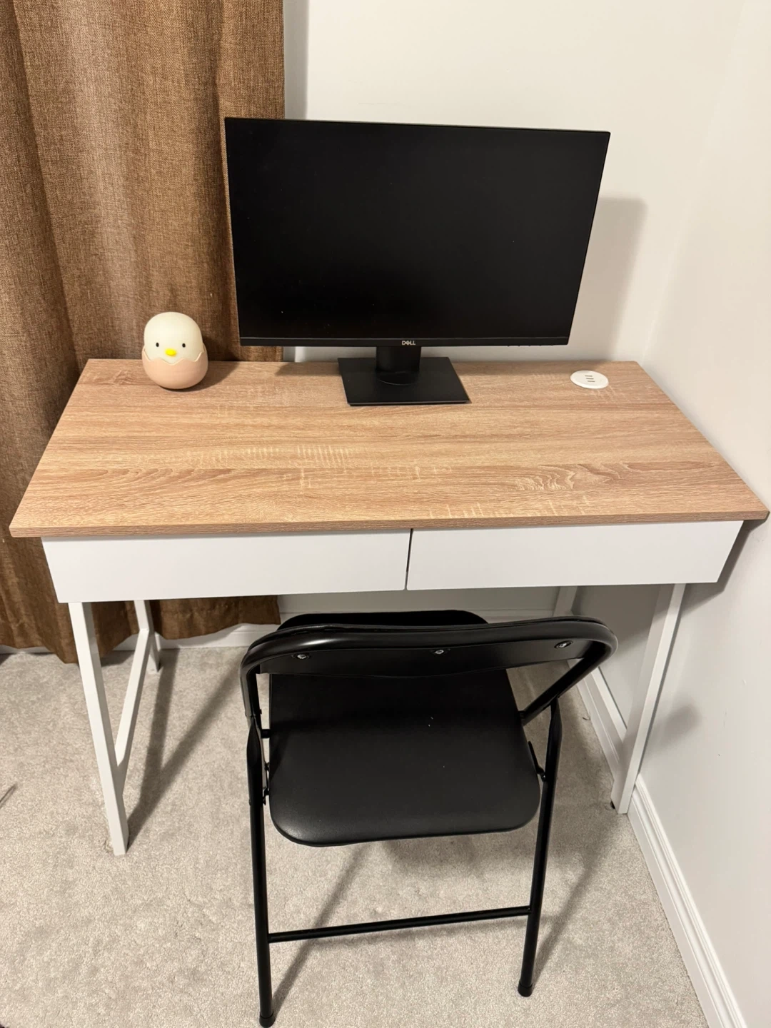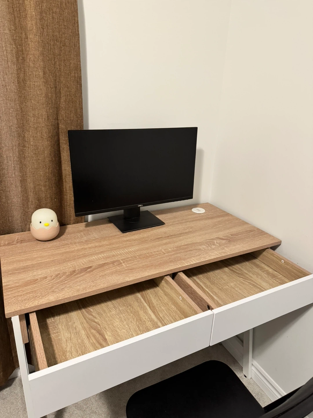 This desk has a light wood grain top and two white drawers.