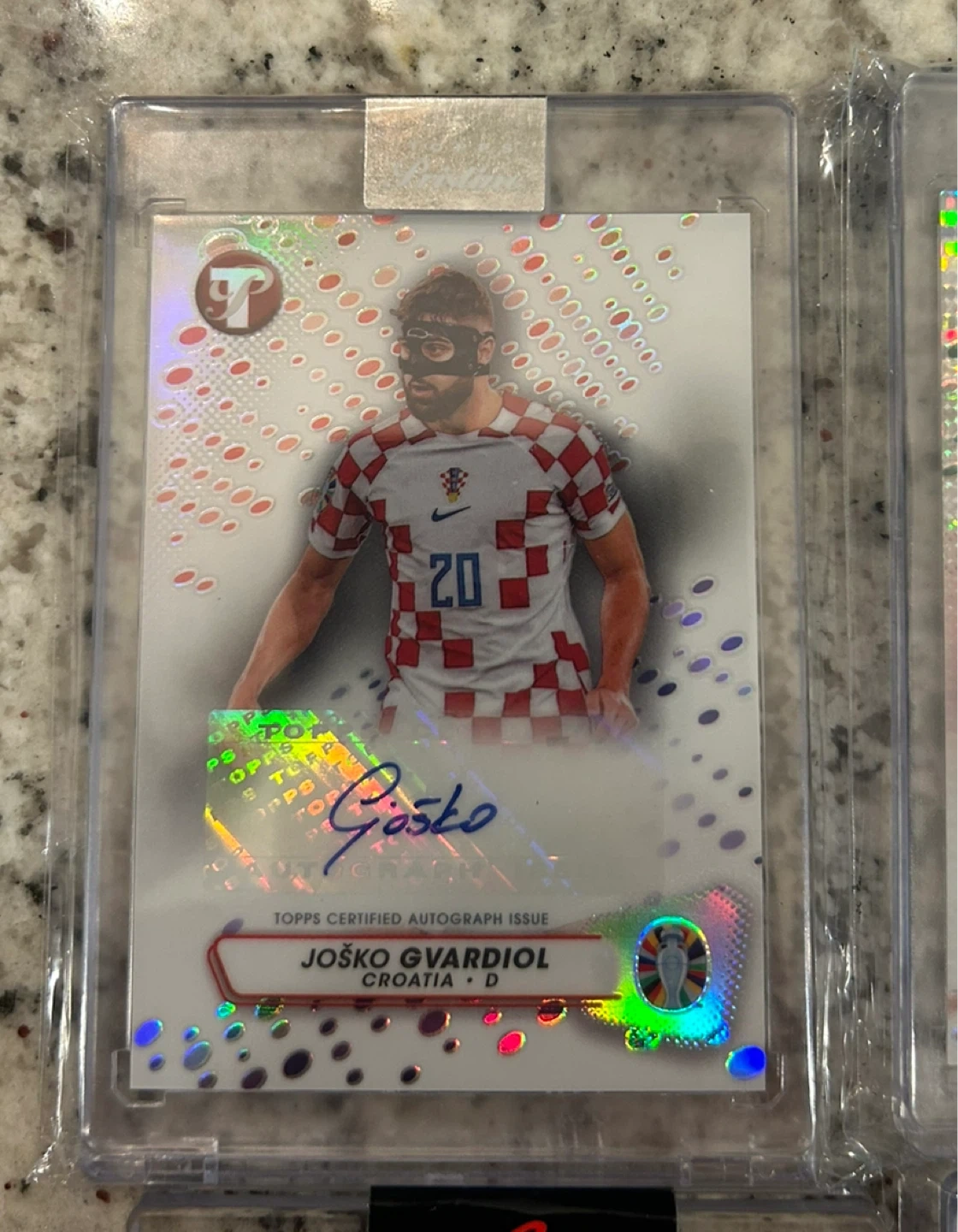 This is a Topps Certified Autograph Issue trading card featuring Joško Gvardiol from Croatia. It's a soccer card with an autograph from the player. The card is in a protective case.