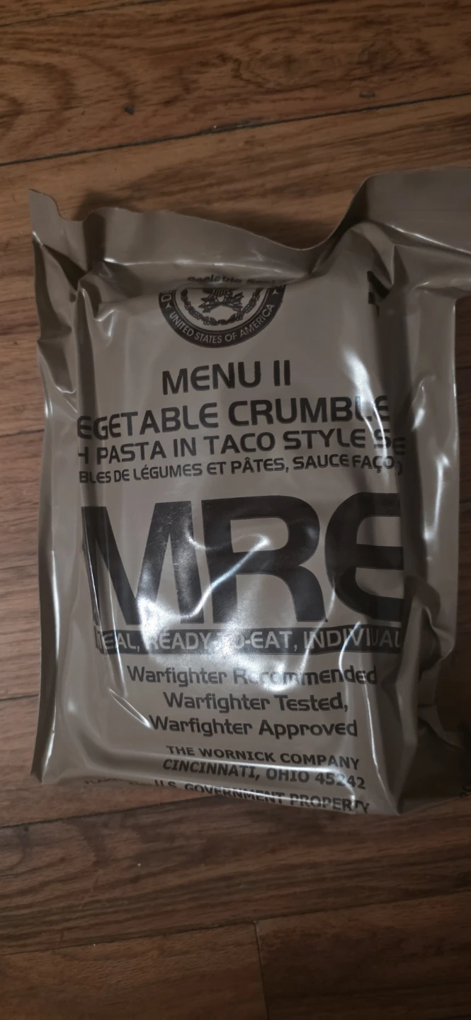 This is a single MRE (Meal, Ready-to-Eat) package. It's Menu II, featuring Vegetable Crumble with Pasta in Taco Style Sauce. Ready to eat, individual meal.