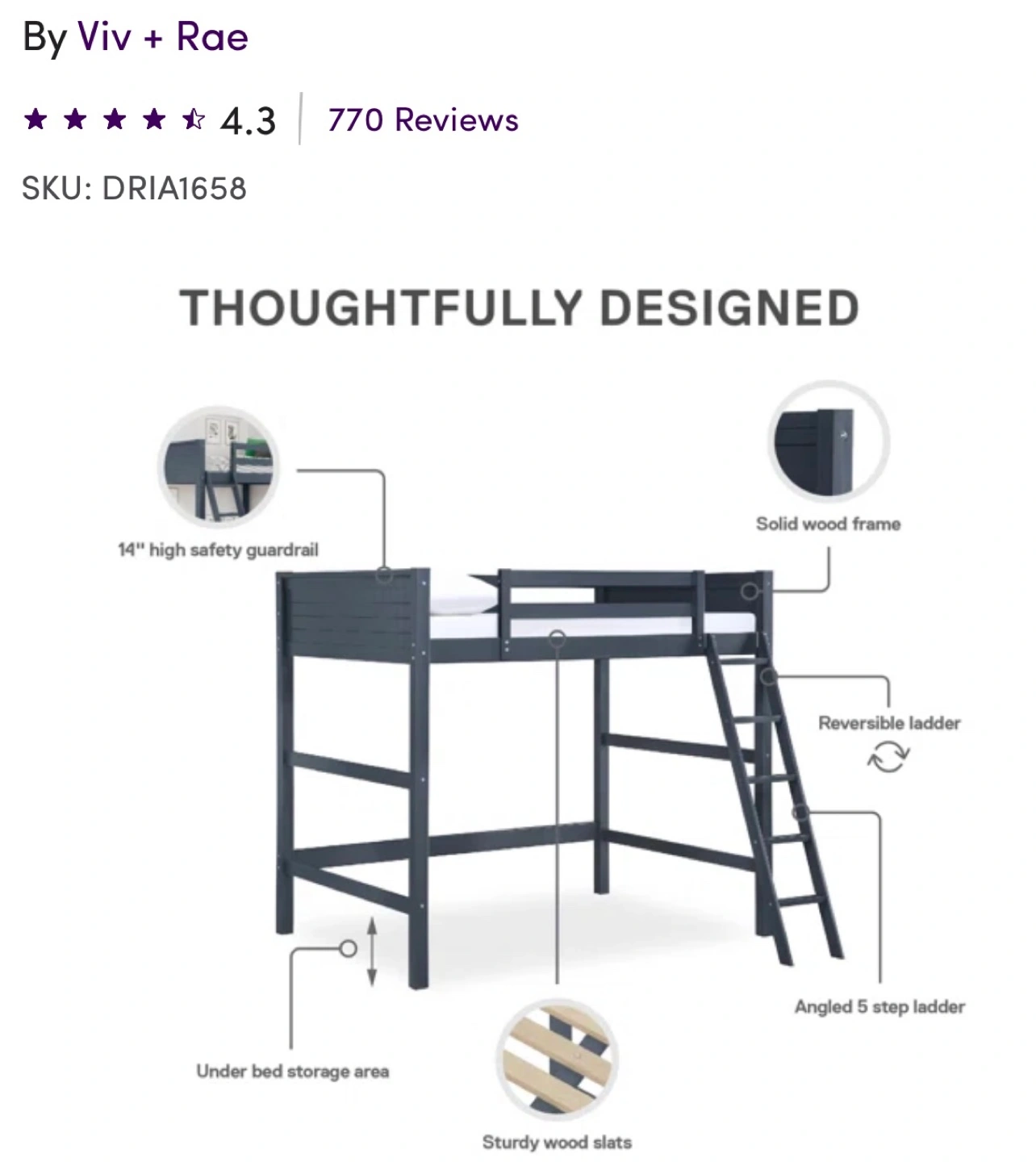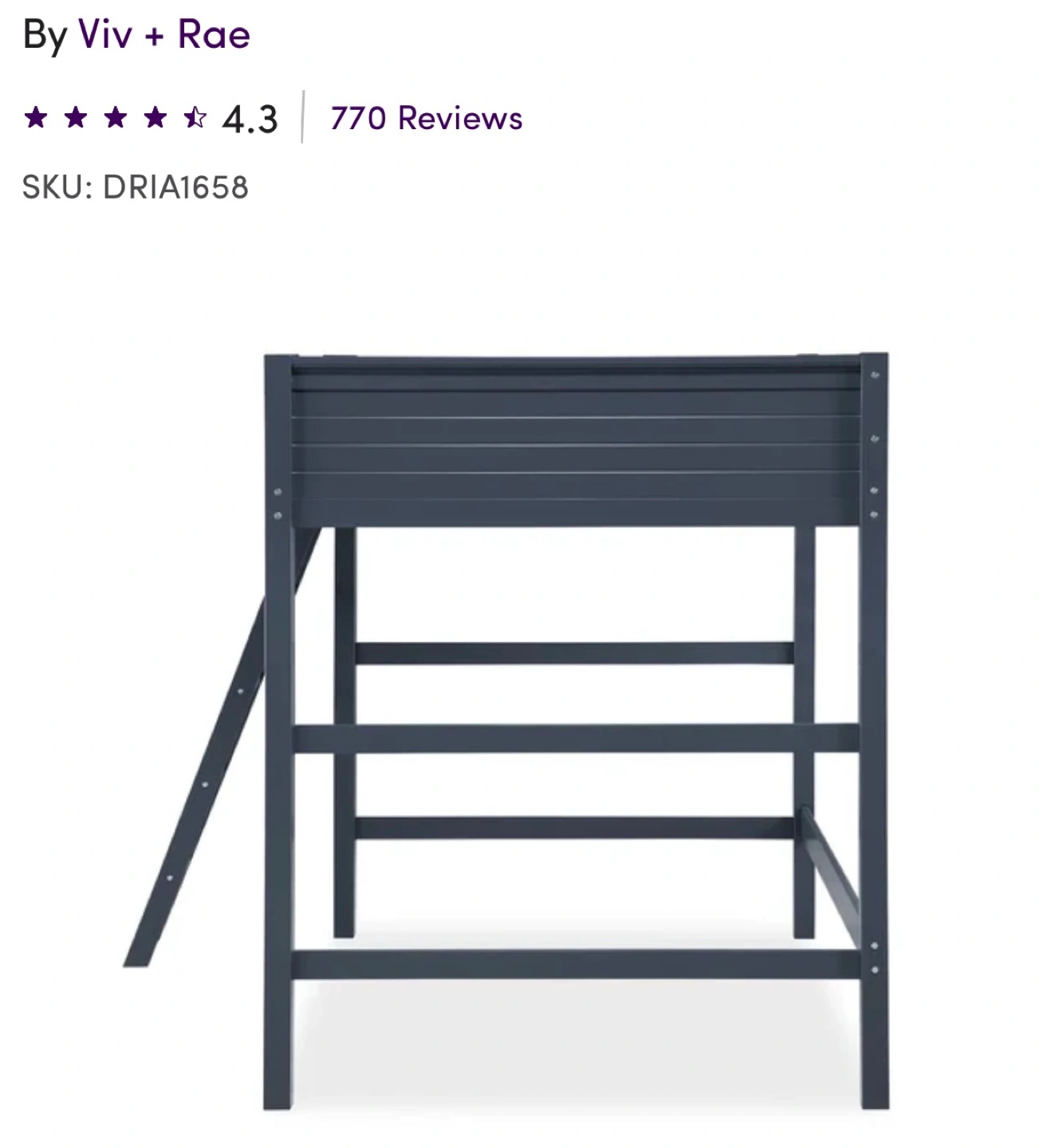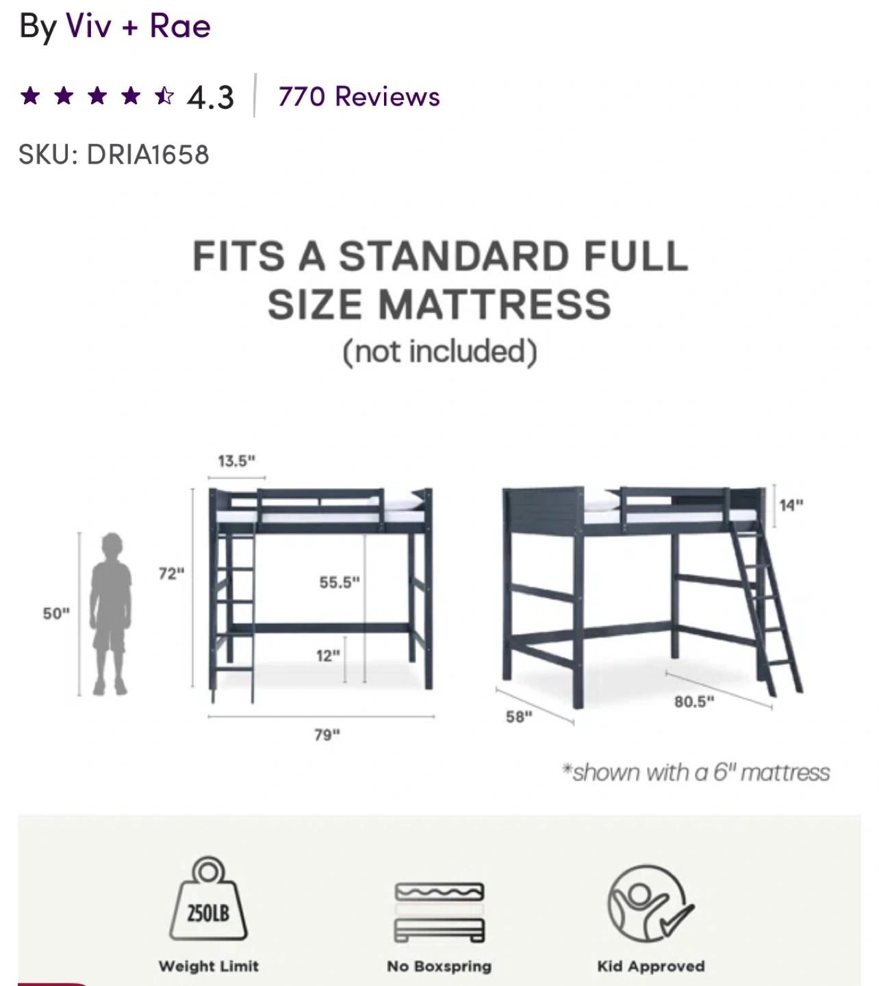 New still in the box. Full-size loft bed, dark blue finish. Solid wood frame, sturdy wood slats. Includes reversible ladder. 14" high safety guardrail. Under-bed storage area for desk. Weight limit 250lbs. No boxspring needed. Kid approved.