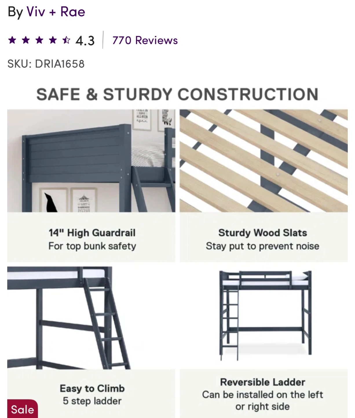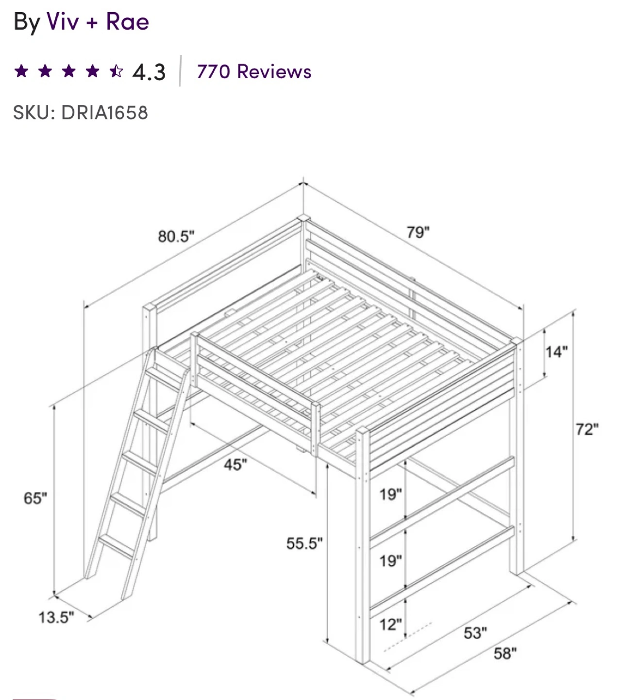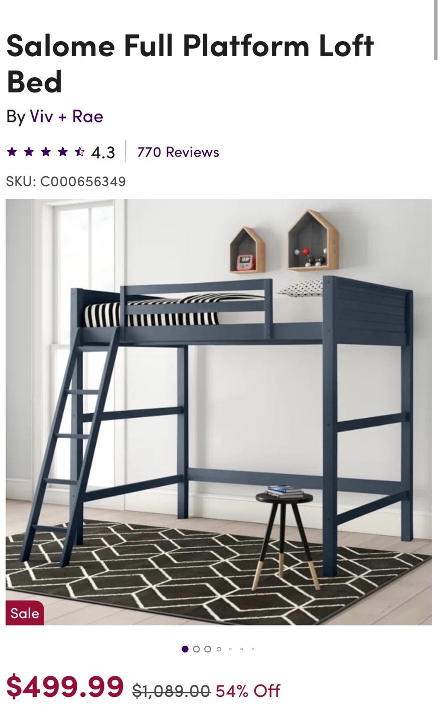 New still in the box. Full-size loft bed, dark blue finish. Solid wood frame, sturdy wood slats. Includes reversible ladder. 14" high safety guardrail. Under-bed storage area for desk. Weight limit 250lbs. No boxspring needed. Kid approved.
