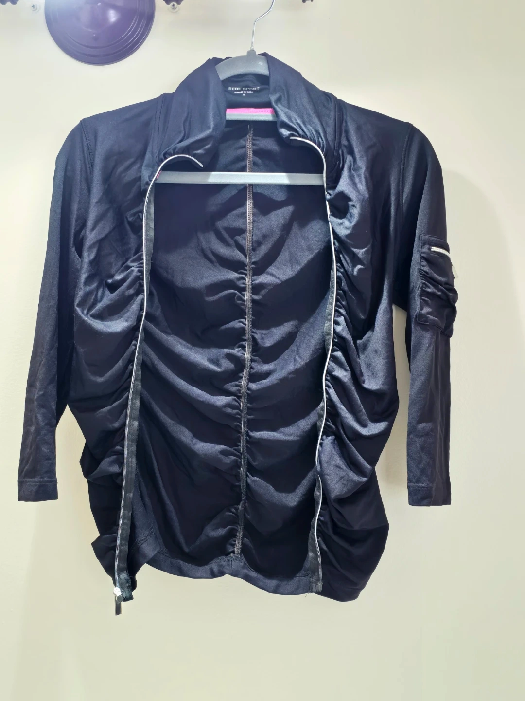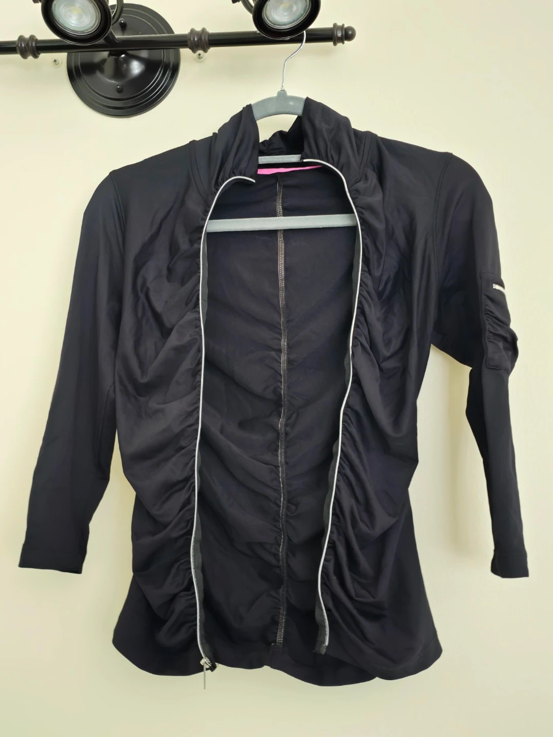 This Bebe Sport top is black with a stylish ruched, stretchy front and a full zip closure. Small zip pocket on arm too. It's designed for athletic wear. Made from a lightweight, breathable fabric.