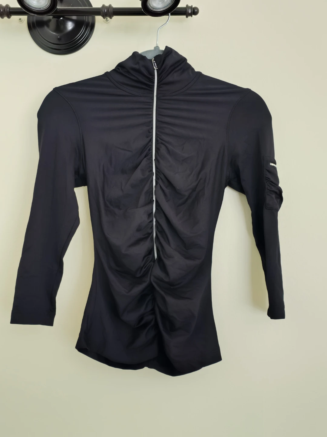 This Bebe Sport top is black with a stylish ruched, stretchy front and a full zip closure. Small zip pocket on arm too. It's designed for athletic wear. Made from a lightweight, breathable fabric.
