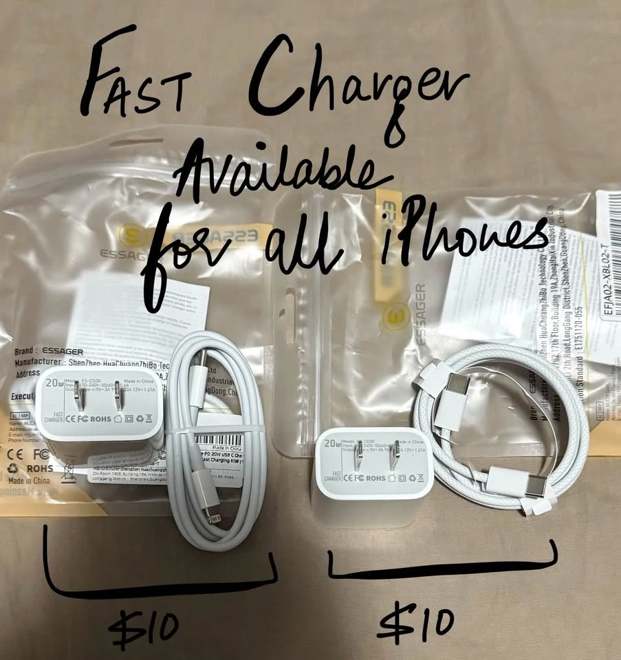 Charger and cable set, $10 per set. Compatible with all iPhones (Lightning or Type-C). This is a new product for pickup only. I am near 255 Tache Ave in St Boniface. I can share the exact address when you're on your way. Please check out my other ads too. Thank you.