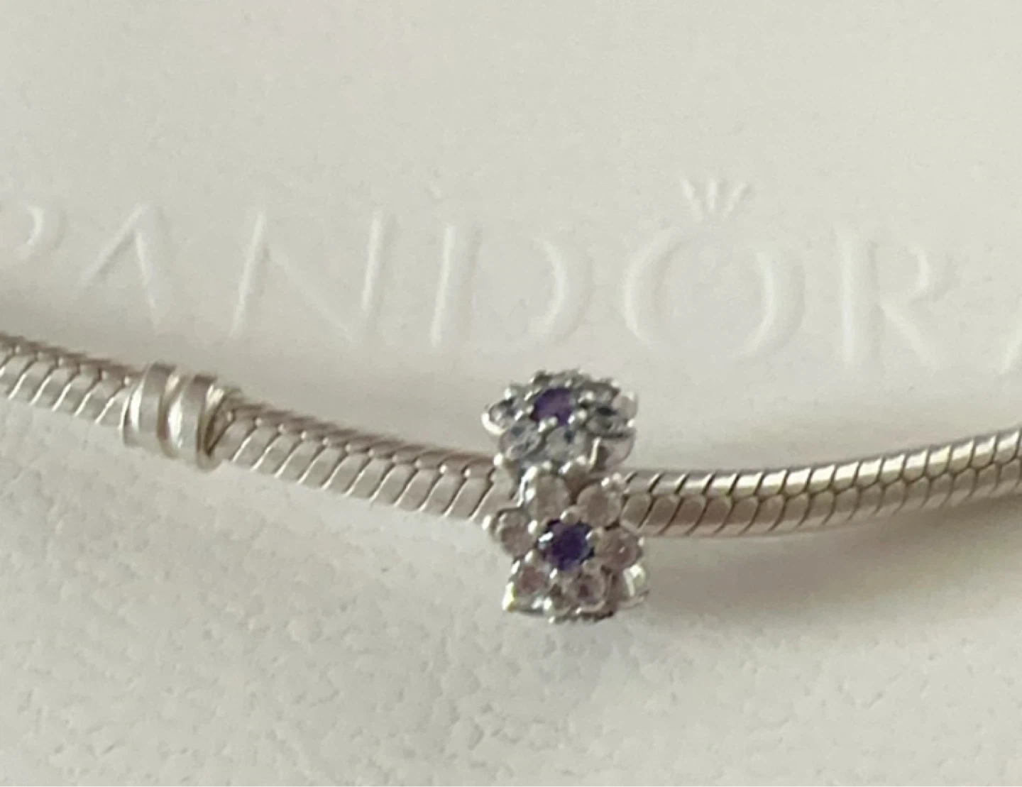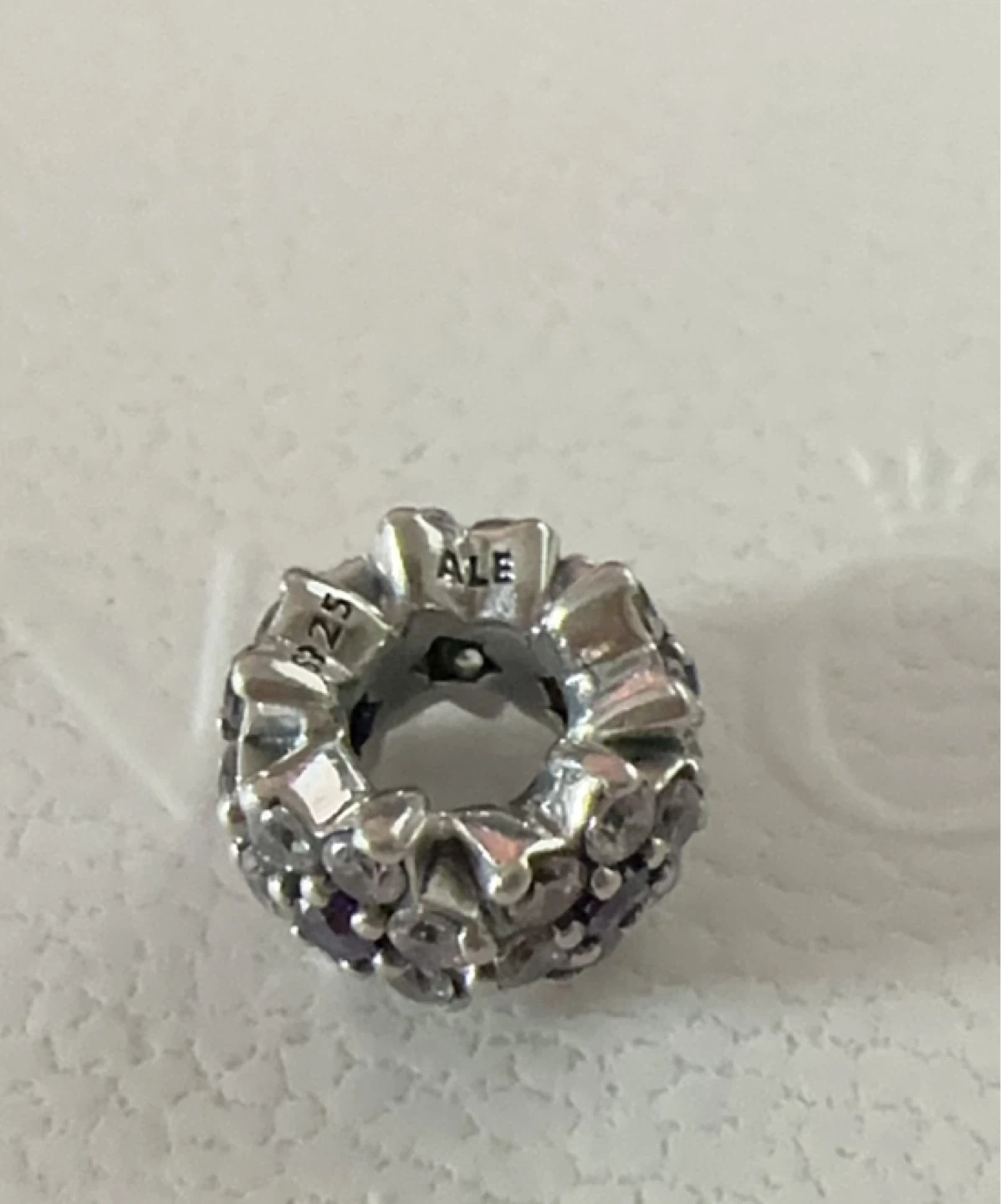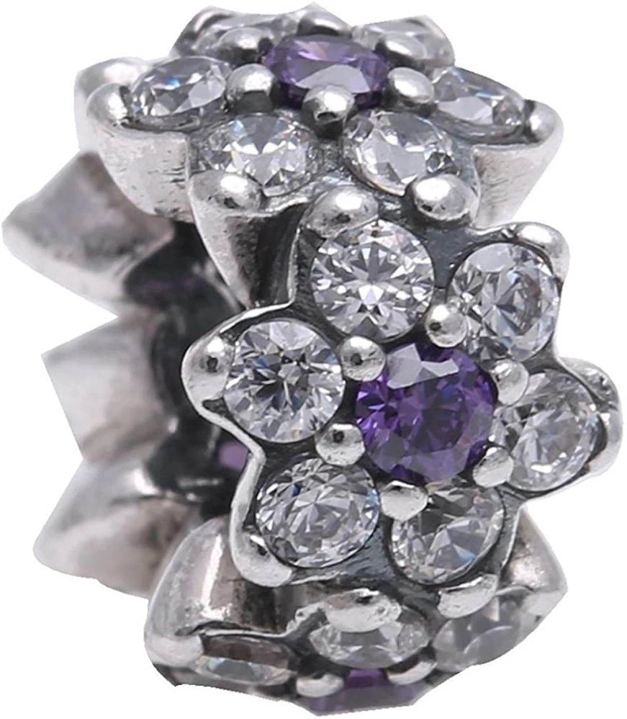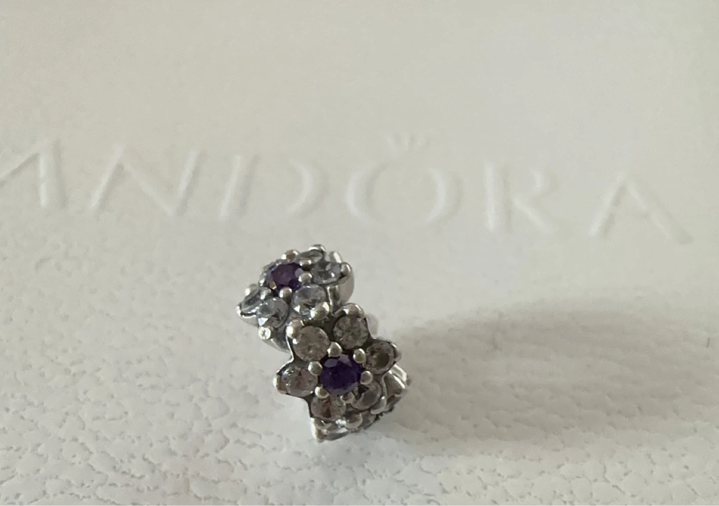 This Pandora charm features a beautiful floral design, accented with purple and clear crystals. It's made from sterling silver with a '925 ALE' stamp for authenticity. It slides onto a Pandora bracelet.