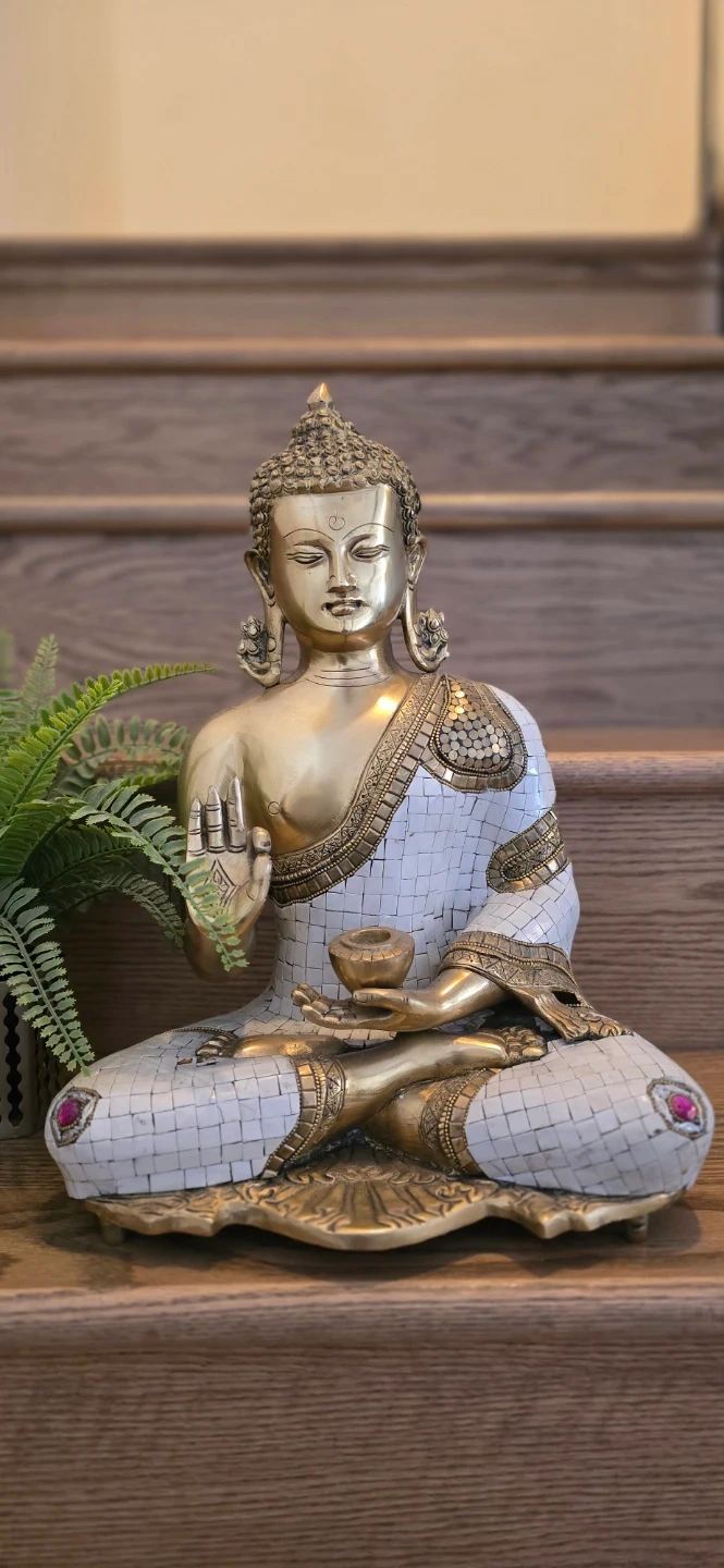 A beautiful brass statue of Buddha in a seated meditative pose. It features intricate detailing with white mosaic stone accents and small pink gem inlays on the base. This piece would add a touch of serenity to any space.