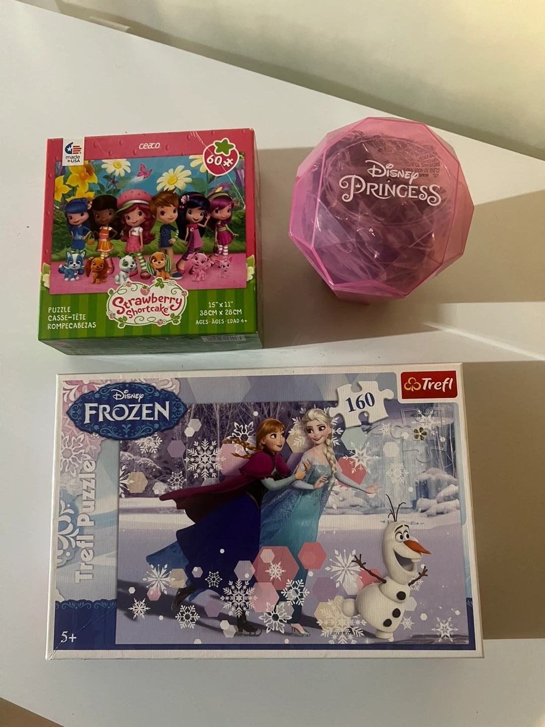 Get ready for some puzzling fun with these puzzles! One features Strawberry Shortcake with 60 pieces, measuring 15" x 11". The other is a Disney Frozen puzzle with 160 pieces, perfect for ages 4 and up.