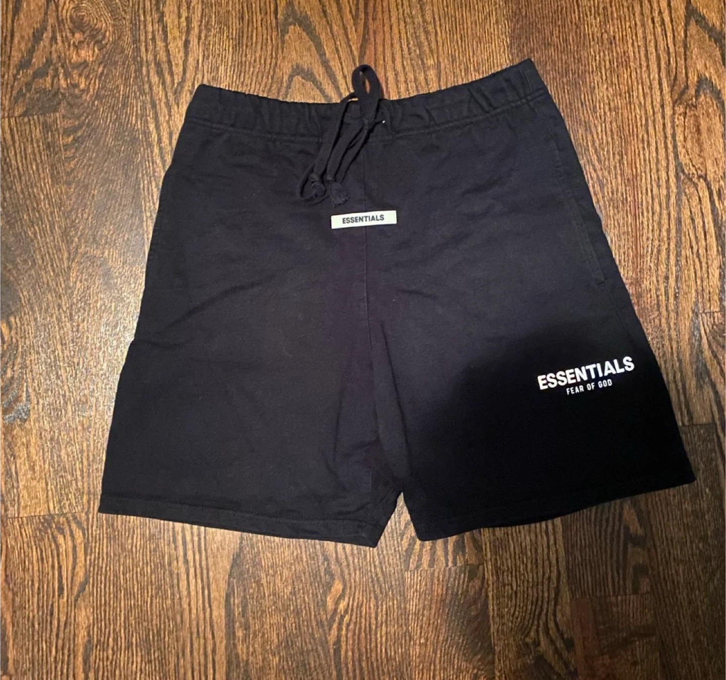 These black shorts are from the Fear of God Essentials line. They feature a drawstring waist and a reflective logo detail on the leg. Made from a soft cotton blend.