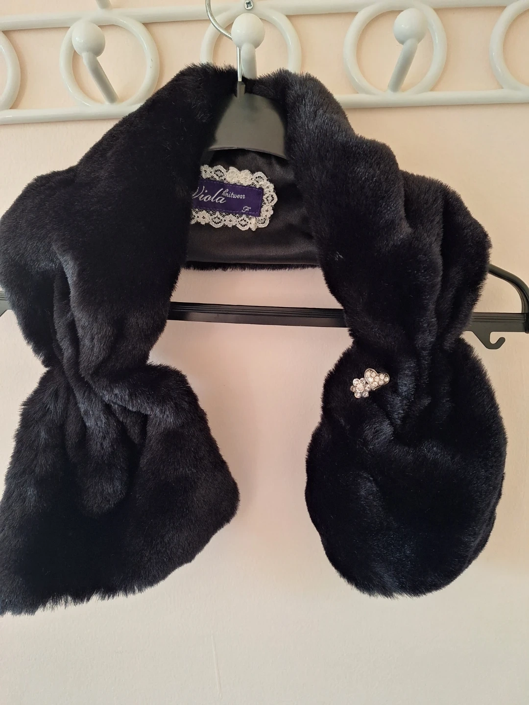 This elegant black faux fur scarf is perfect for adding a touch of glamour to any outfit. It features a satin lining and a decorative jeweled brooch. It's made from soft faux fur.