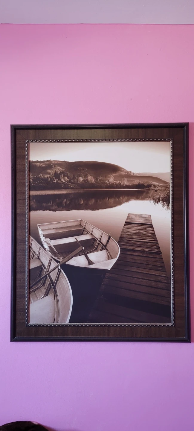 This framed print depicts two rowboats tied to a wooden dock on a calm lake with rolling hills in the background. The artwork is presented in a dark, textured frame, adding a rustic touch to the scene. It's a serene piece that would enhance any room's decor.