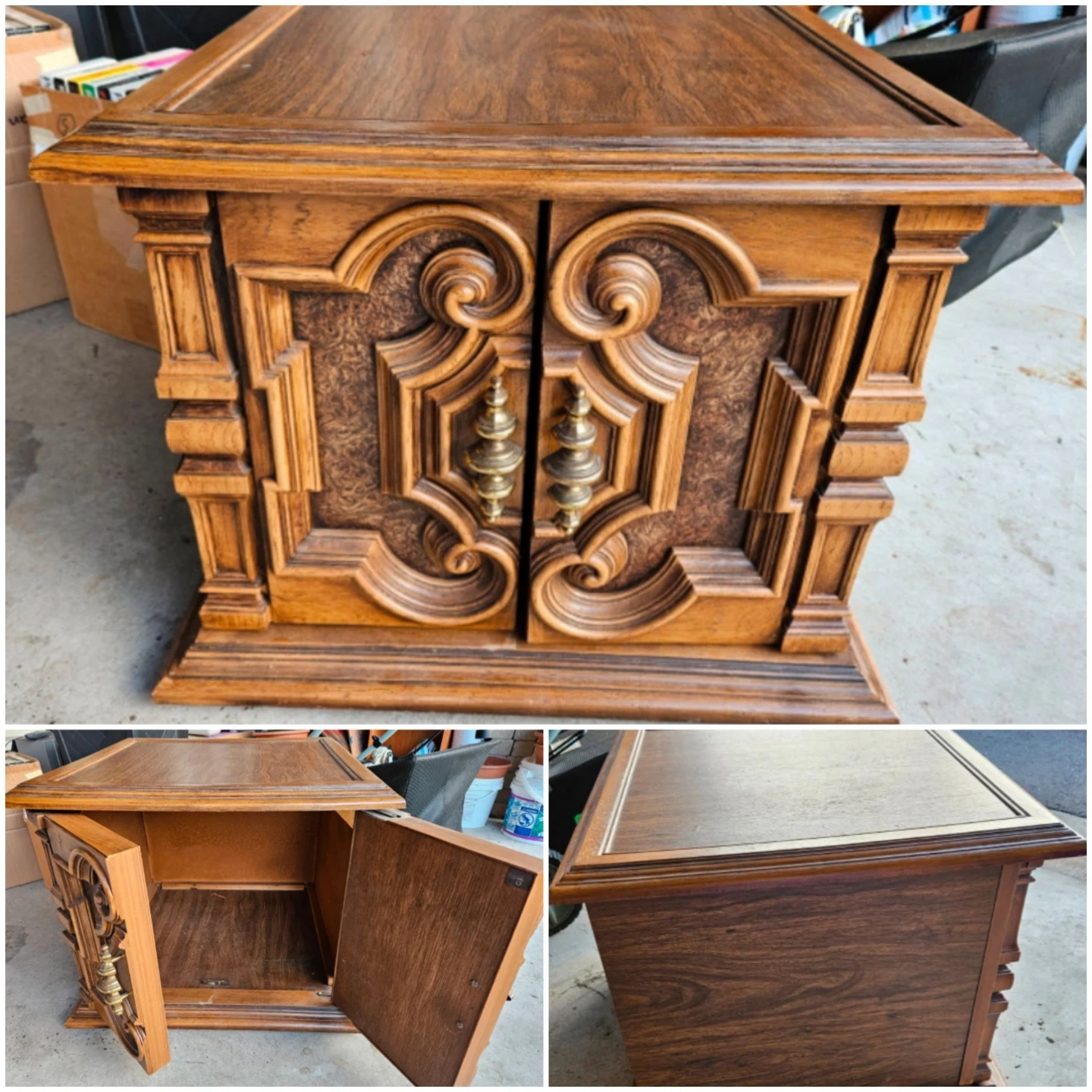 Ornate decorative end/side table is great for adding character to any room; use it as a side table, bedside table, or decorative accent! This cabinet is in like-new condition, 25"x25" square.