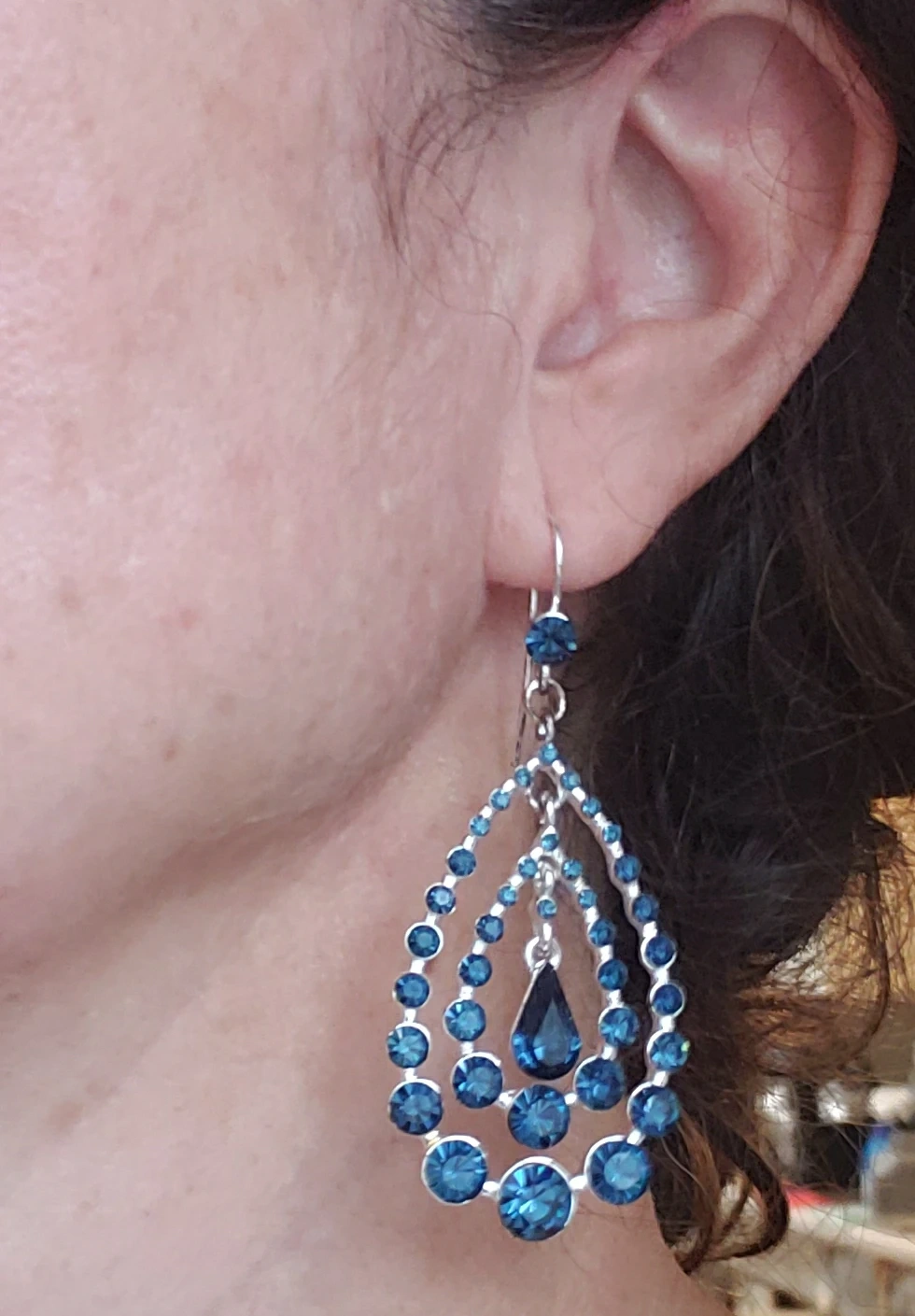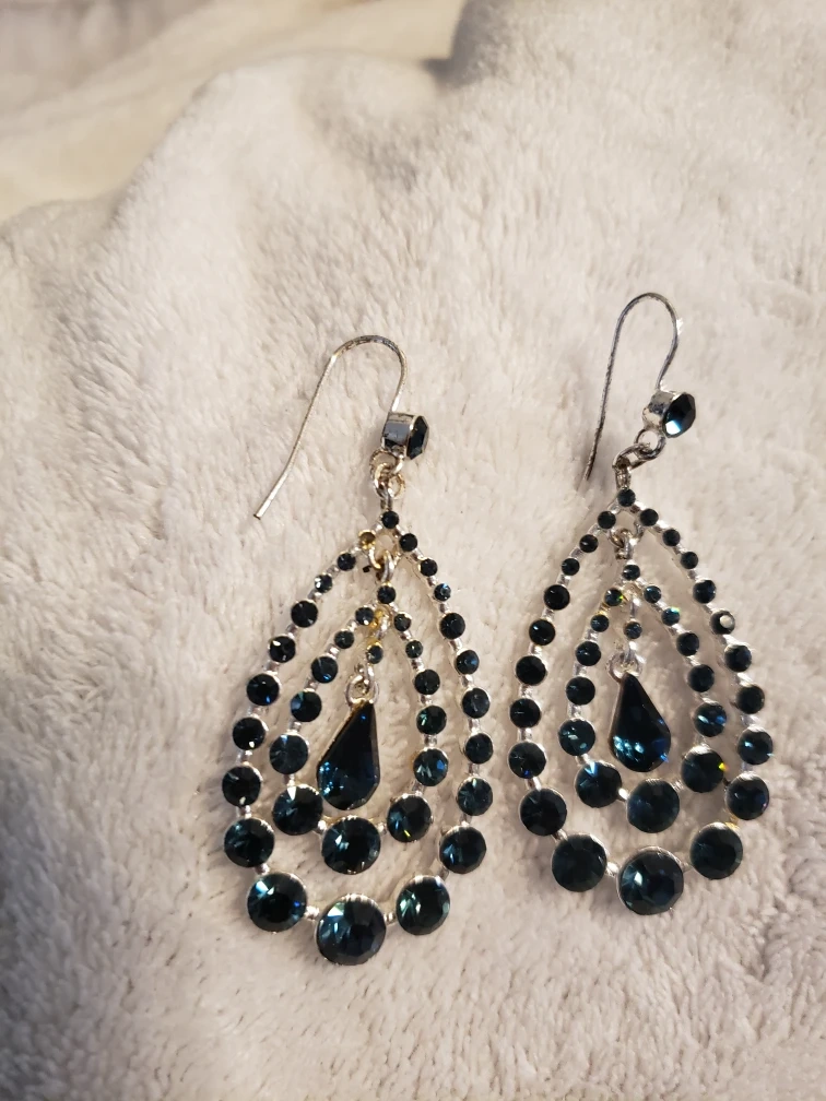 Beautiful teardrop dangle earrings in a lovely shade of blue! These earrings are in great condition and would be a perfect addition to any outfit. They feature a layered teardrop design with small, sparkly blue stones and a larger teardrop-shaped stone in the centre