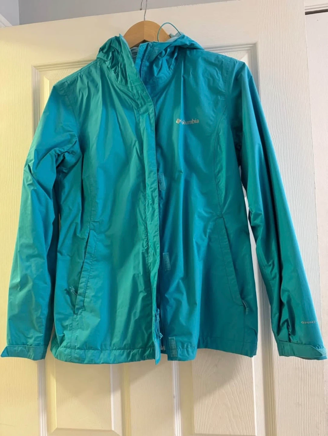 This is a Columbia hooded rain jacket in a teal colour. It's lightweight and suitable for outdoor activities. Omni-Tech material.