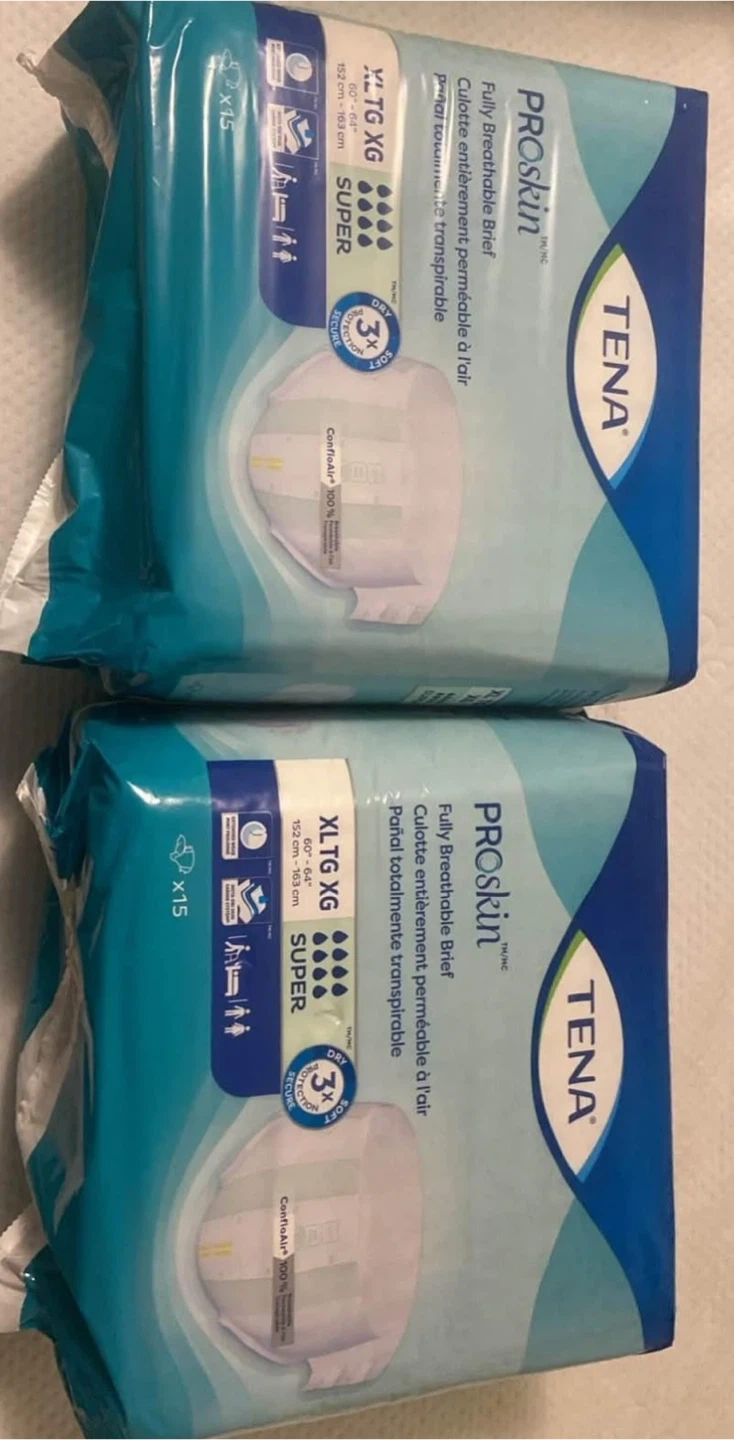 Two packages of TENA ProSkin ProSkin Fully Breathable Briefs. Size is XL TG XG. Each package contains 15 briefs. These are overnight briefs.