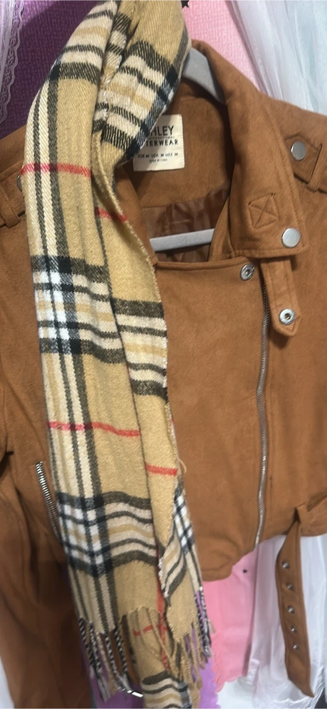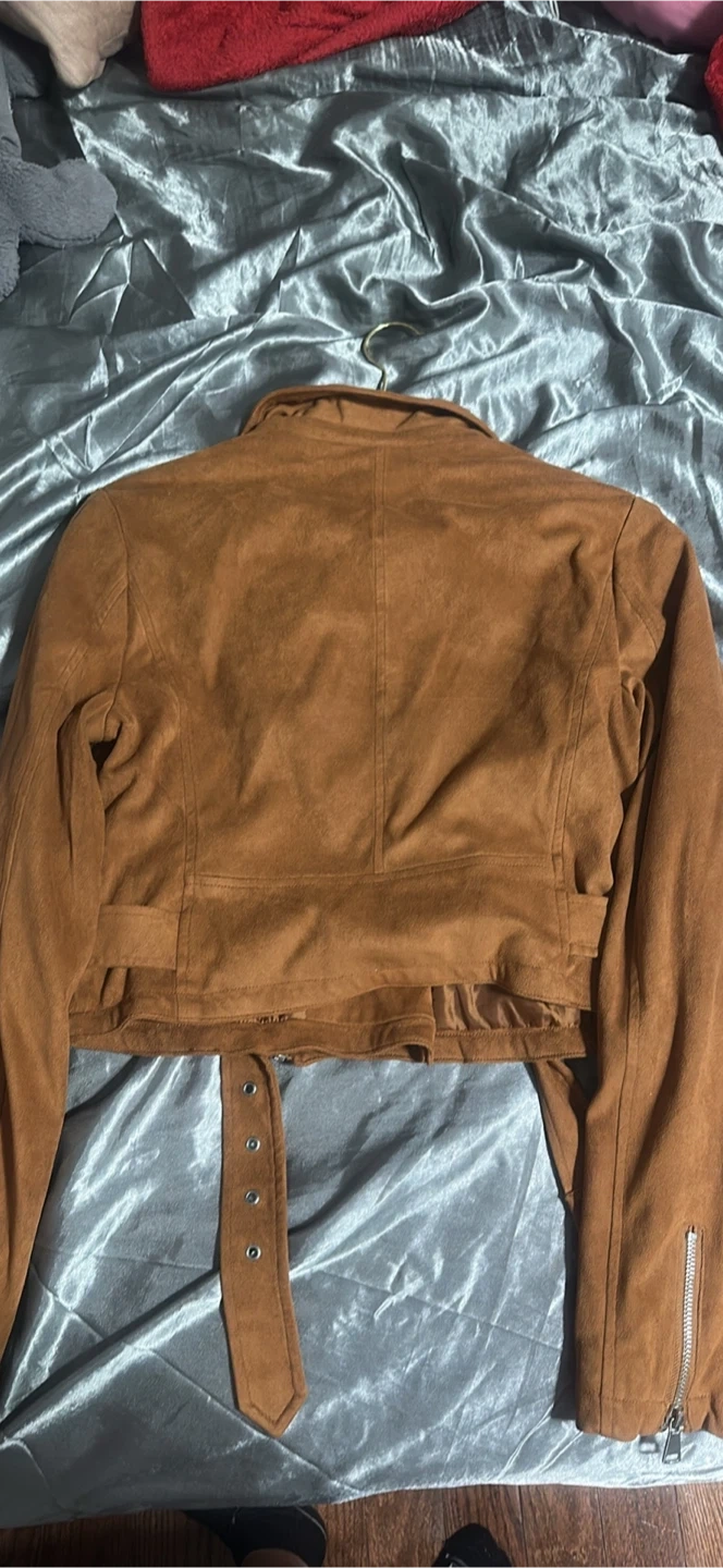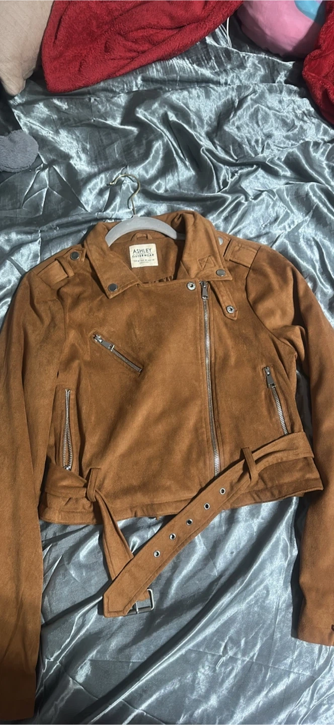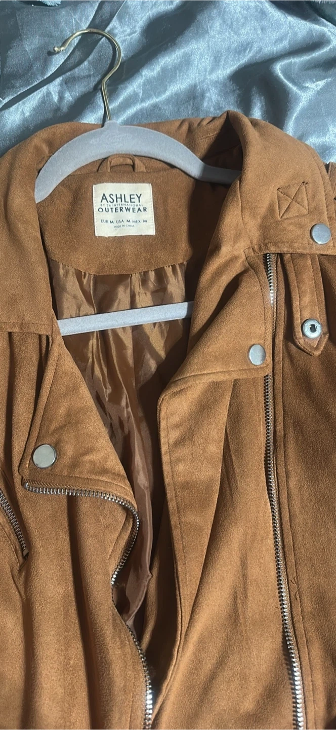 I'm selling an Ashley Outerwear jacket in a stylish brown color. It's a size M and has a unique design with zippers and a belt. This jacket is perfect for adding a touch of style to any outfit!