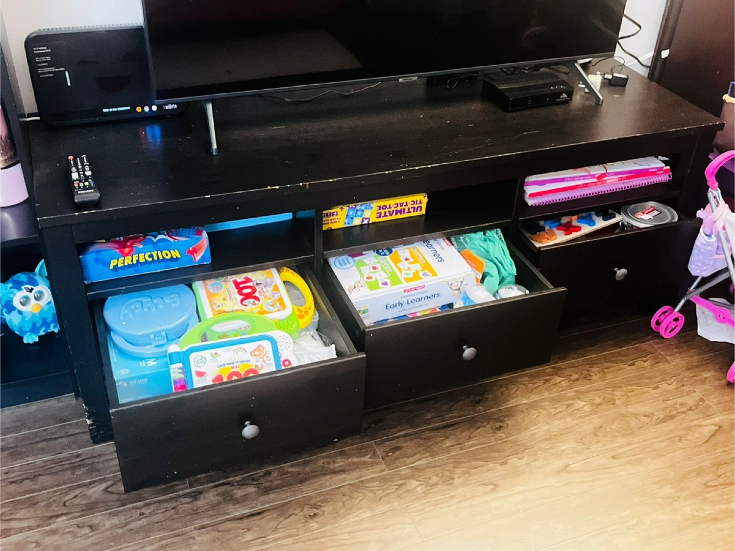 It features three spacious drawers for storage and three open compartments for consoles or cable boxes.