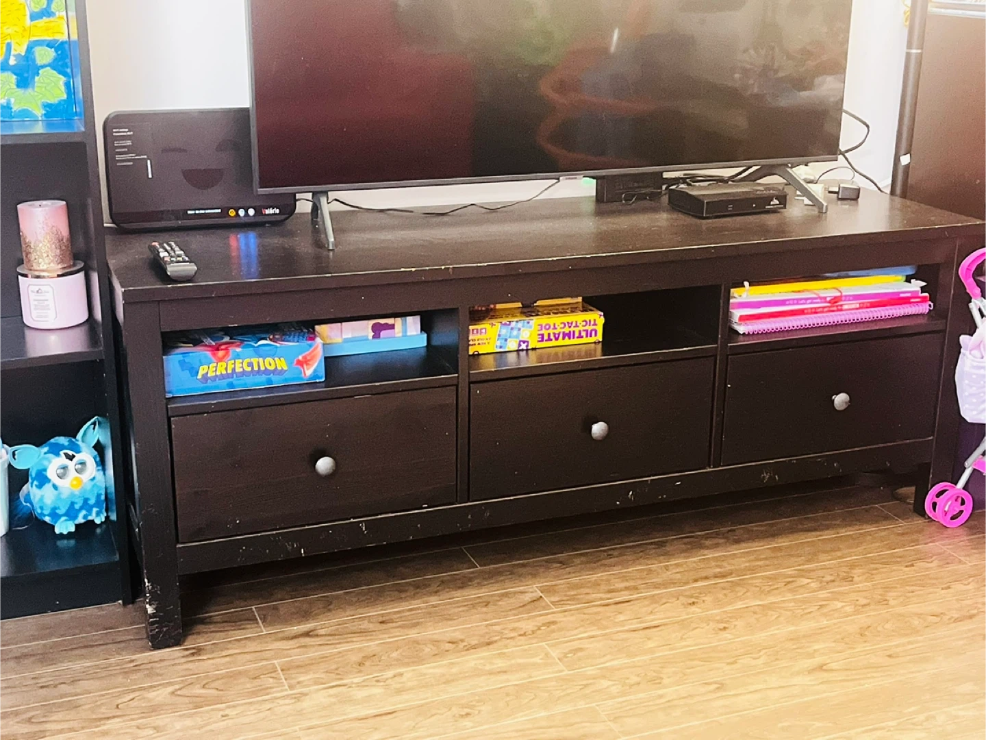 Selling our IKEA HEMNES TV unit in the classic black-brown finish.