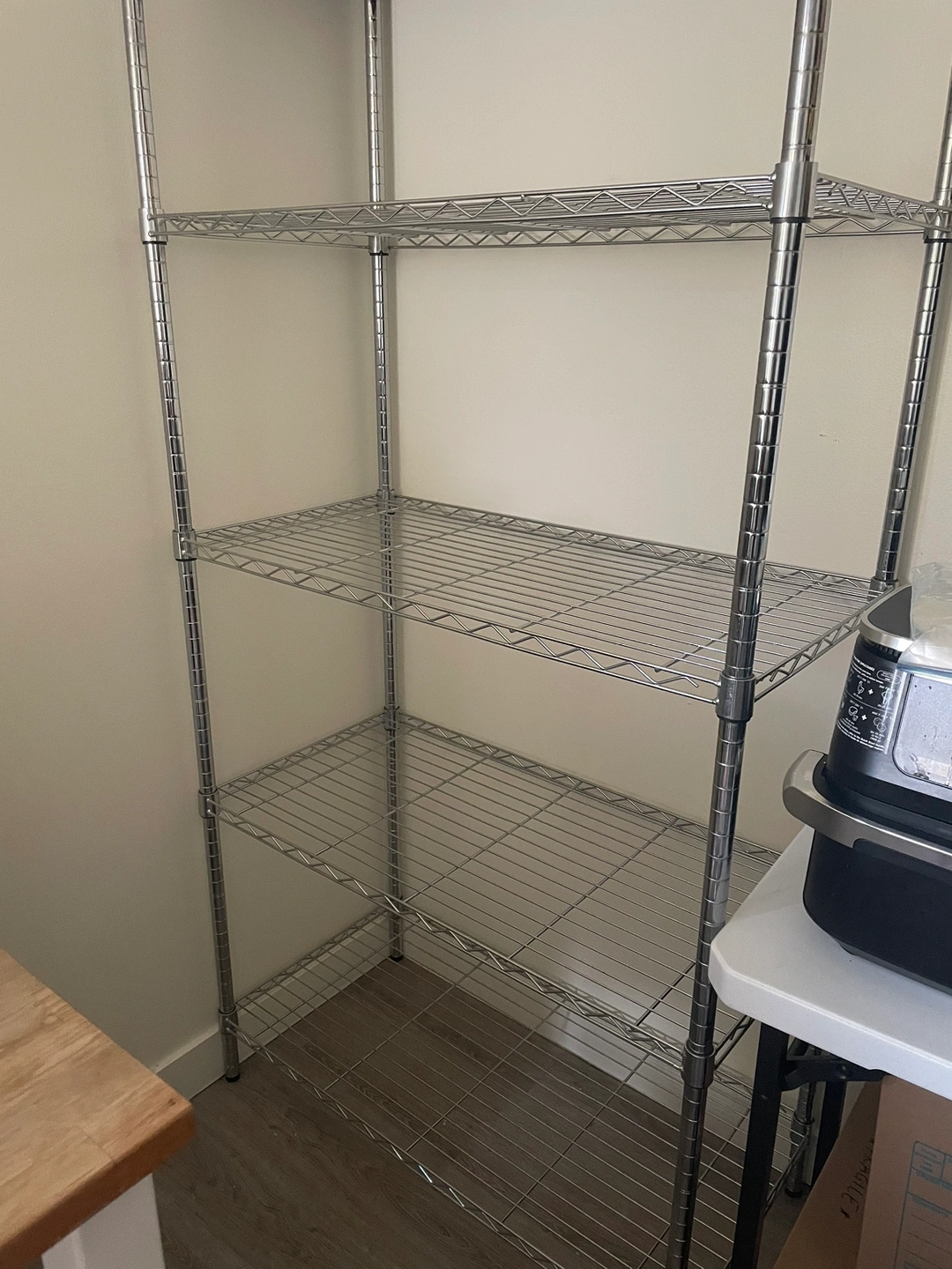 This shelving unit is in great shape and would be perfect for your kitchen, pantry, or garage. It's easy to assemble and disassemble. It comes with four shelves. It has a chrome finish.