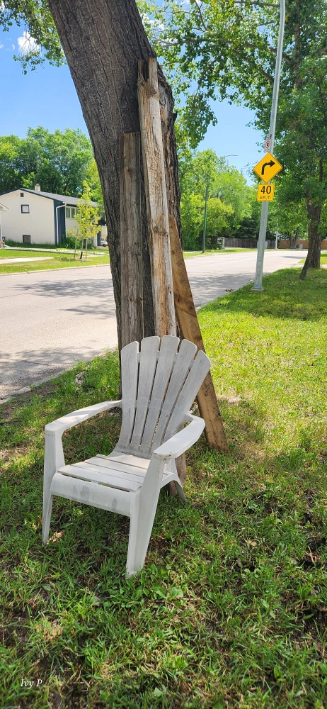 giving away a white plastic Adirondack chair. It has some signs of use, but is still sturdy and comfortable for relaxing outdoors. Perfect for your patio or garden!