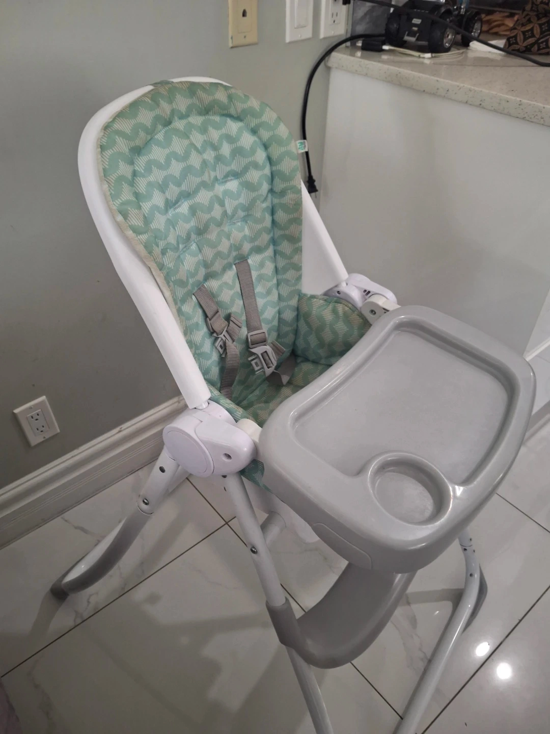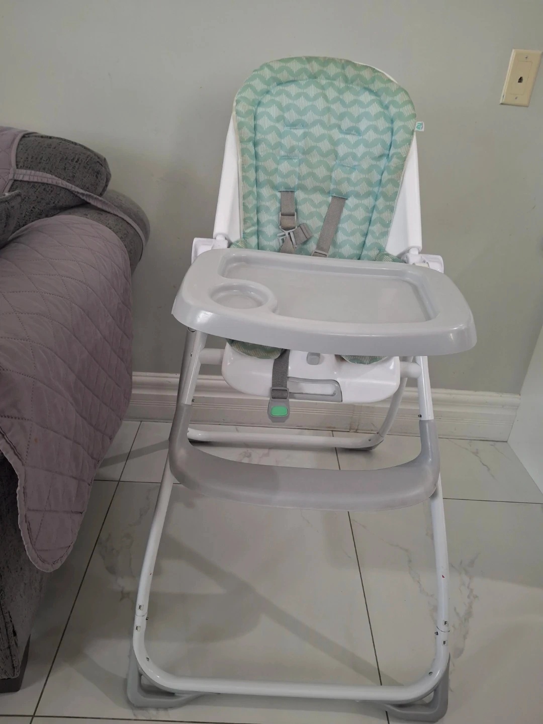 A baby high chair with a removable tray and a comfortable padded seat. It features a 5-point harness for safety. The chair's frame is white with grey accents and the seat pad has a green geometric pattern. It's designed for easy cleaning and storage. Great for meal times!