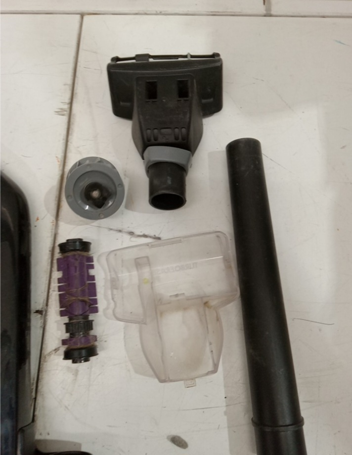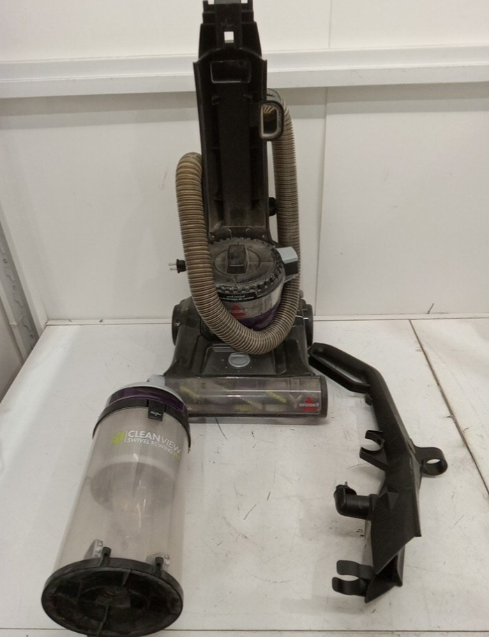 This is a used Bissell Cleanview Swivel Rewind vacuum cleaner. It is in working condition but comes with some signs of wear.