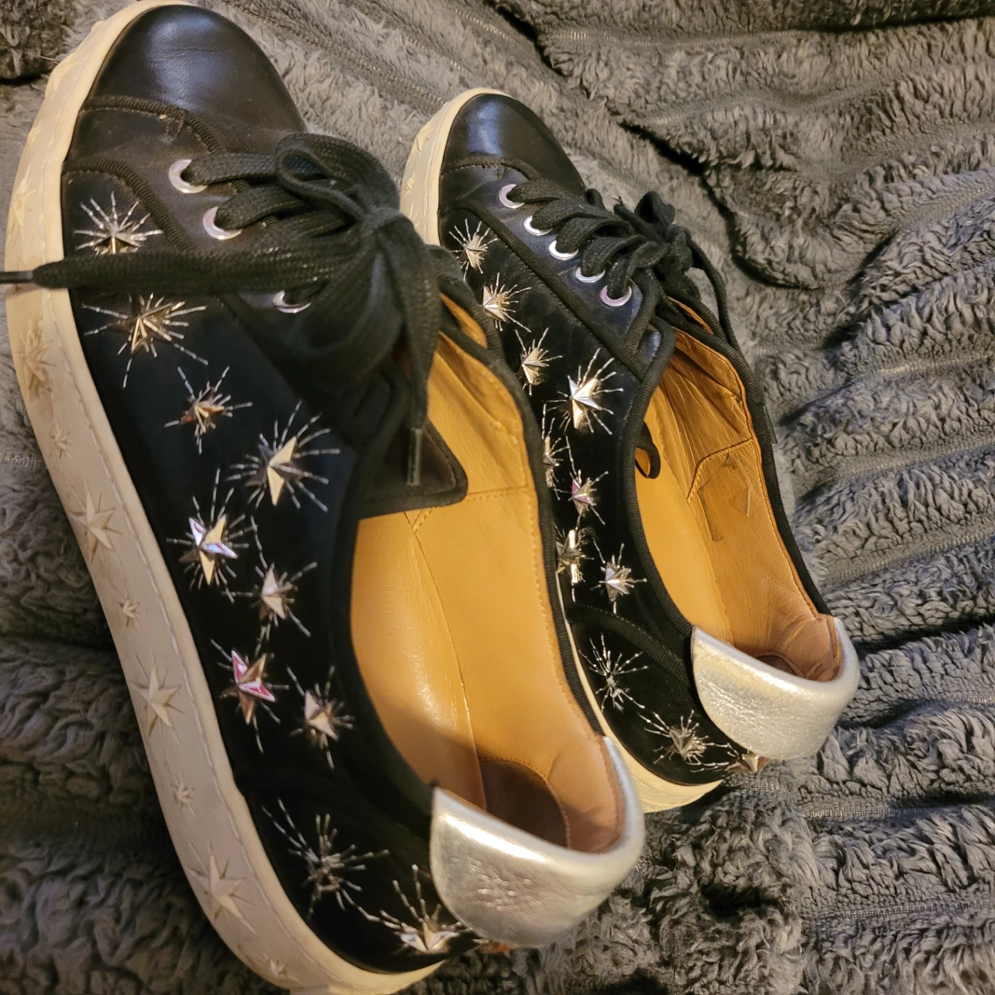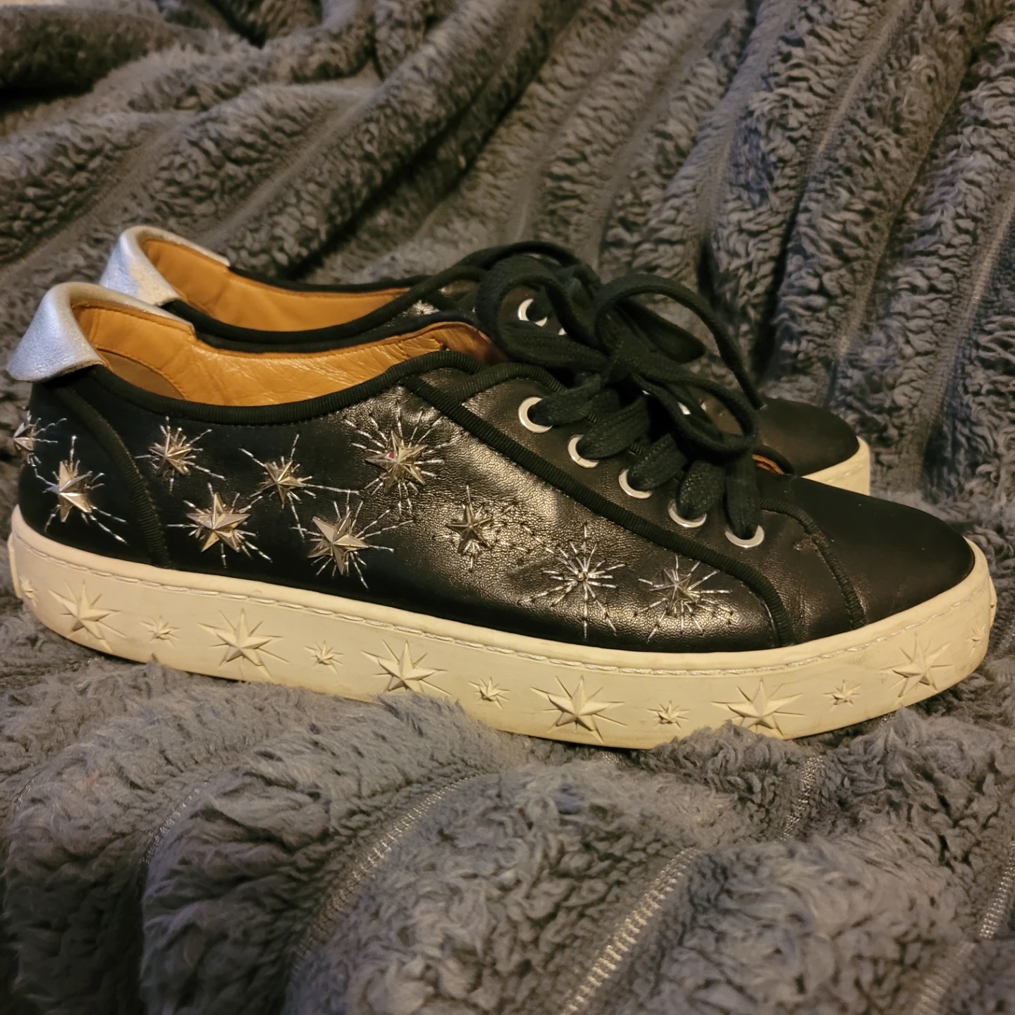 Aquazzura black leather sneakers with star stud embellishments. Features a lace-up front and silver heel accents. Made in Italy. Size eu 37/ us7 (fits 8 but narrow)