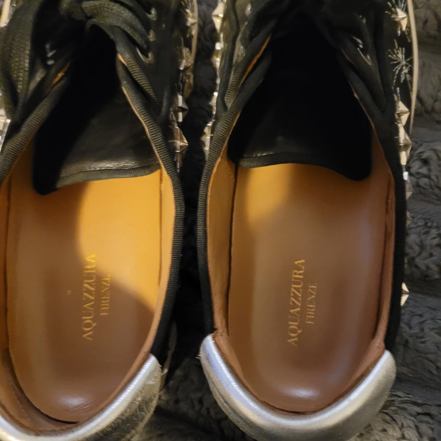 Aquazzura black leather sneakers with star stud embellishments. Features a lace-up front and silver heel accents. Made in Italy. Size eu 37/ us7 (fits 8 but narrow)