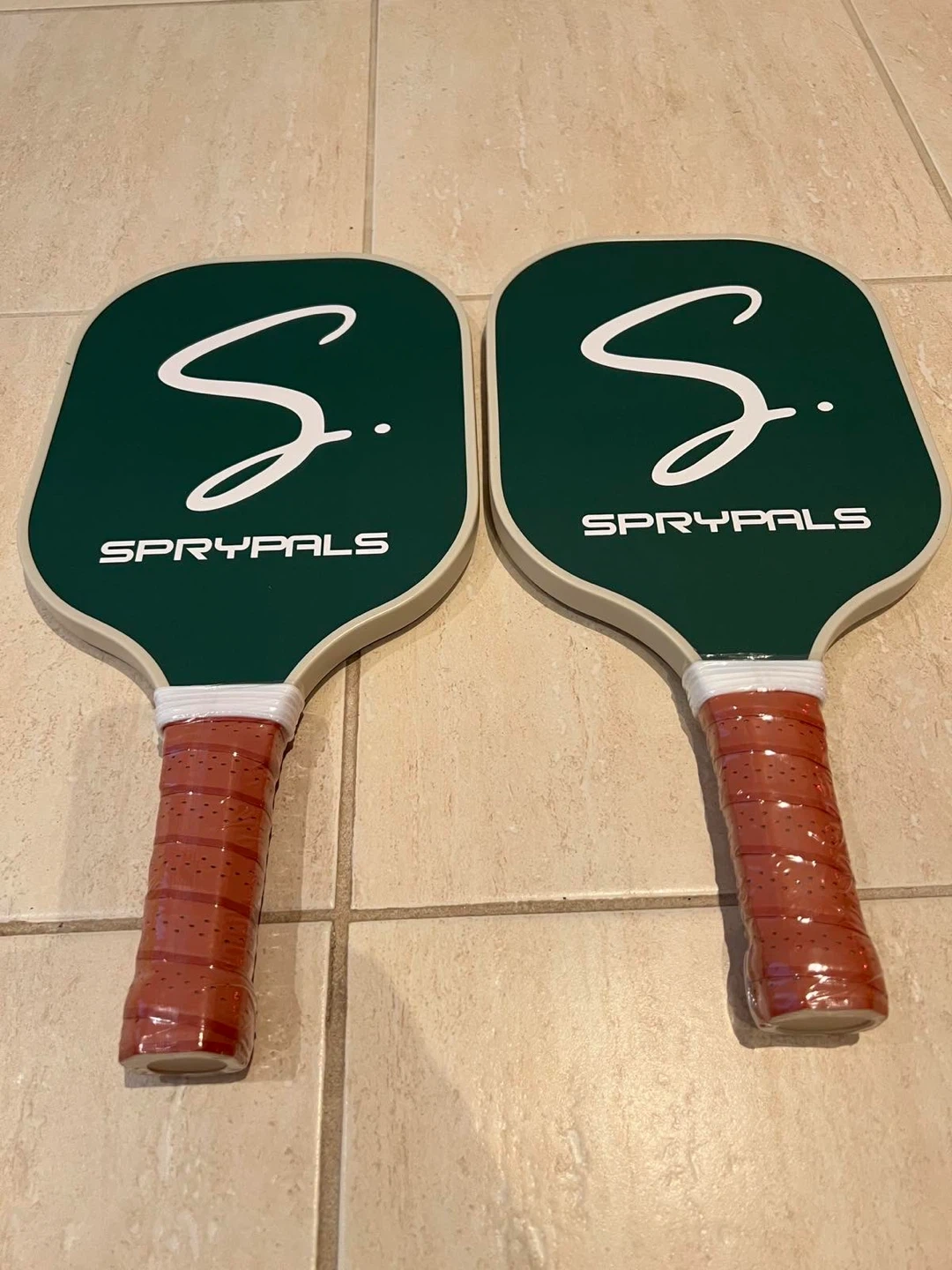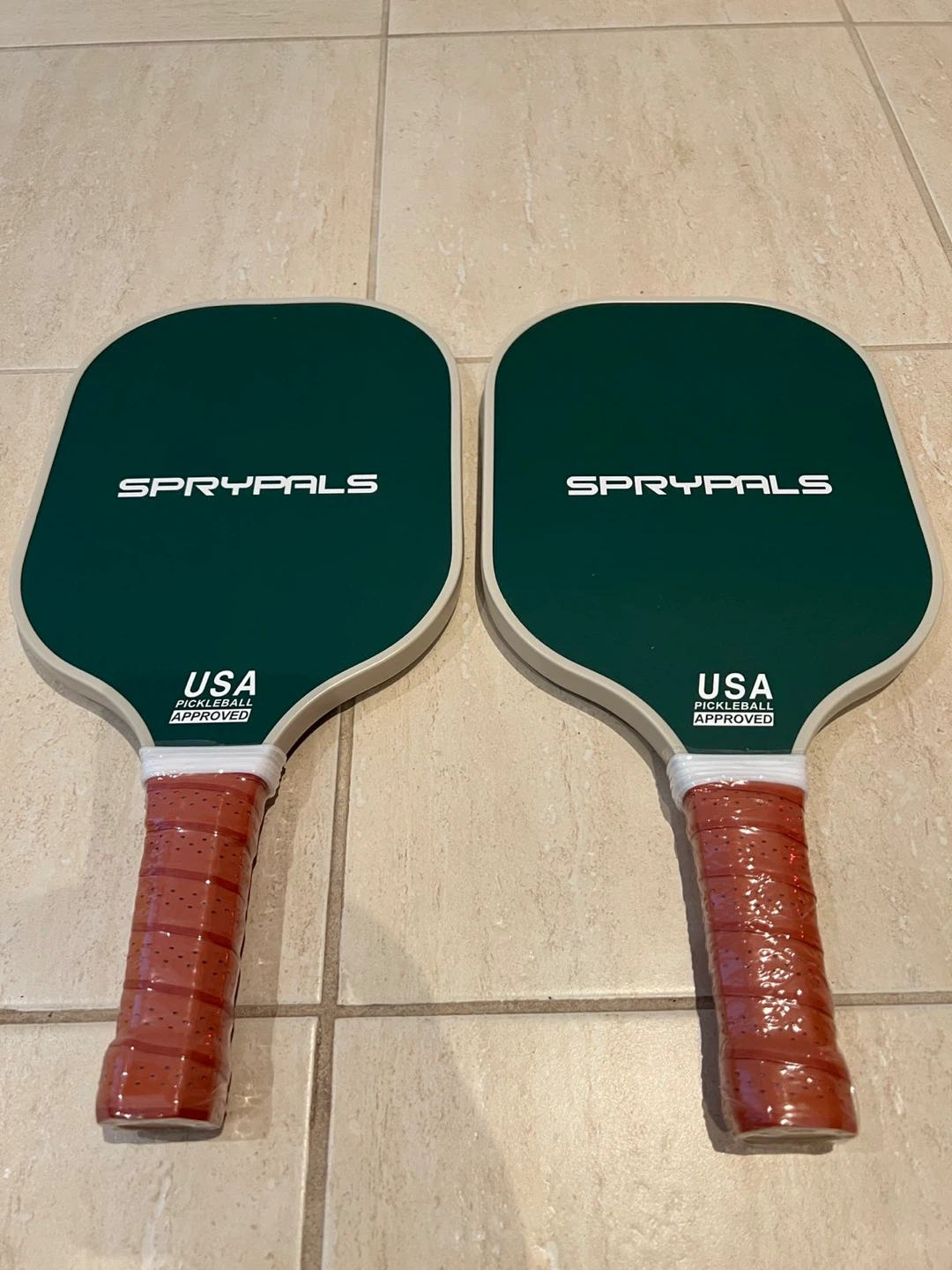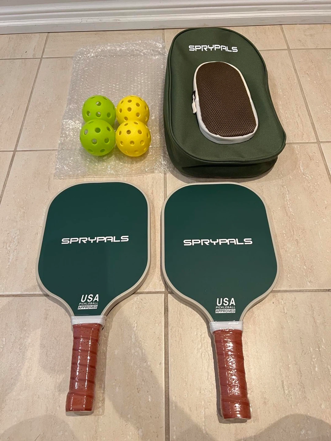 This set includes two SPRYPALS pickleball paddles and four pickleballs, two green and two yellow. It also comes with a green carrying bag. The paddles are USA Pickleball Approved. This set is great for starting out or for casual games!