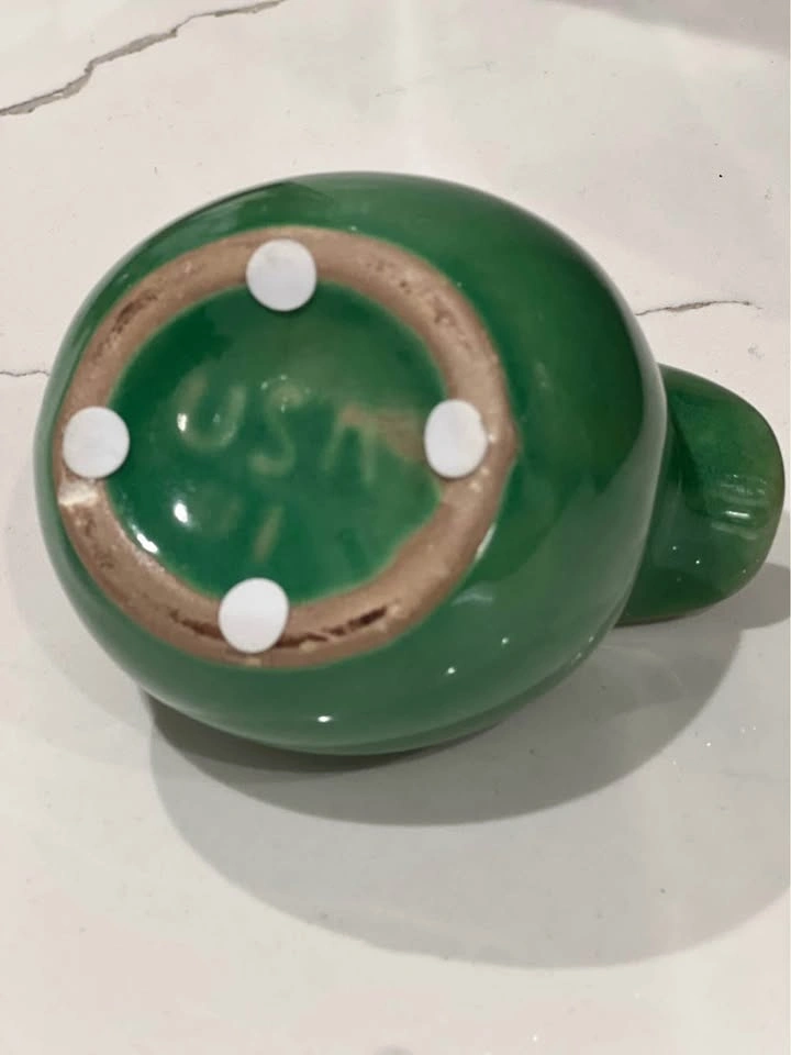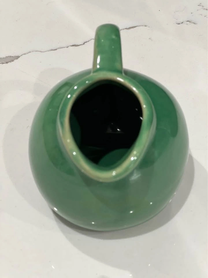 This vintage USA Ball Creamer Pitcher Jug is a small green ceramic piece with a round shape and a solid pattern. Made of clay and ceramic, it includes a handle and is an original piece from the Ball brand. Standing at 3.5 inches tall, this retro collectible exudes a Mid Century Modern aesthetic that adds a touch of nostalgia to any kitchen or dining set. Size: Miniature pitcher/creamer (approx. 3.5 inches tall; 4.5 inches from spout to handle)