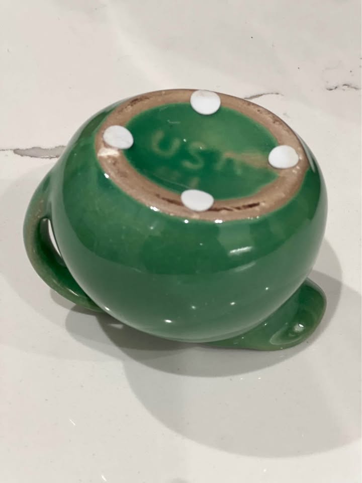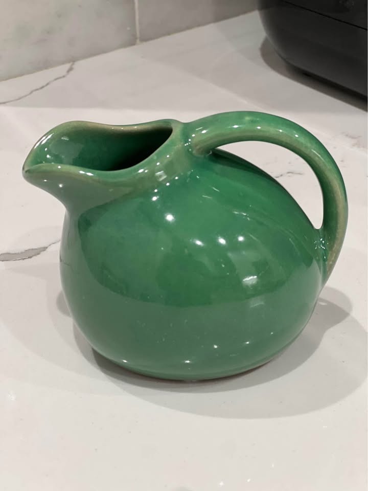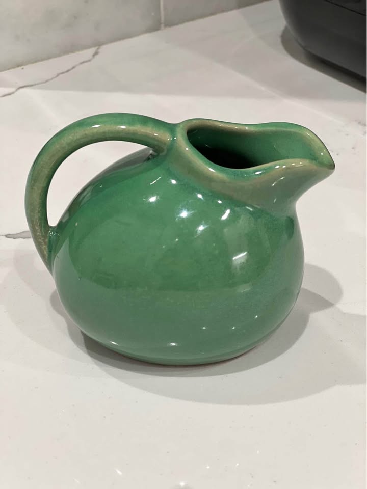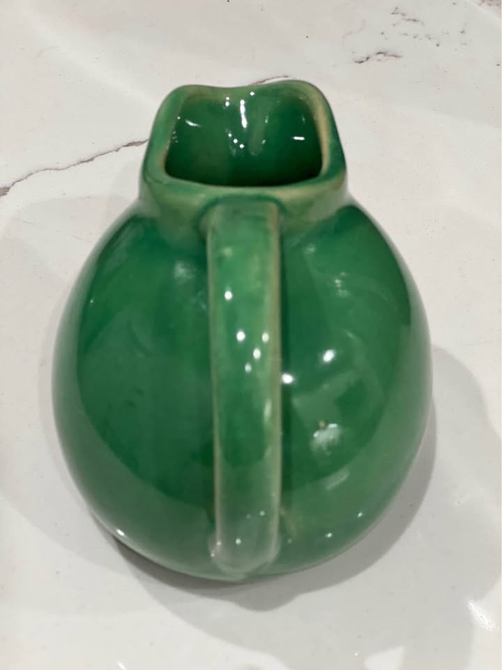 This vintage USA Ball Creamer Pitcher Jug is a small green ceramic piece with a round shape and a solid pattern. Made of clay and ceramic, it includes a handle and is an original piece from the Ball brand. Standing at 3.5 inches tall, this retro collectible exudes a Mid Century Modern aesthetic that adds a touch of nostalgia to any kitchen or dining set. Size: Miniature pitcher/creamer (approx. 3.5 inches tall; 4.5 inches from spout to handle)