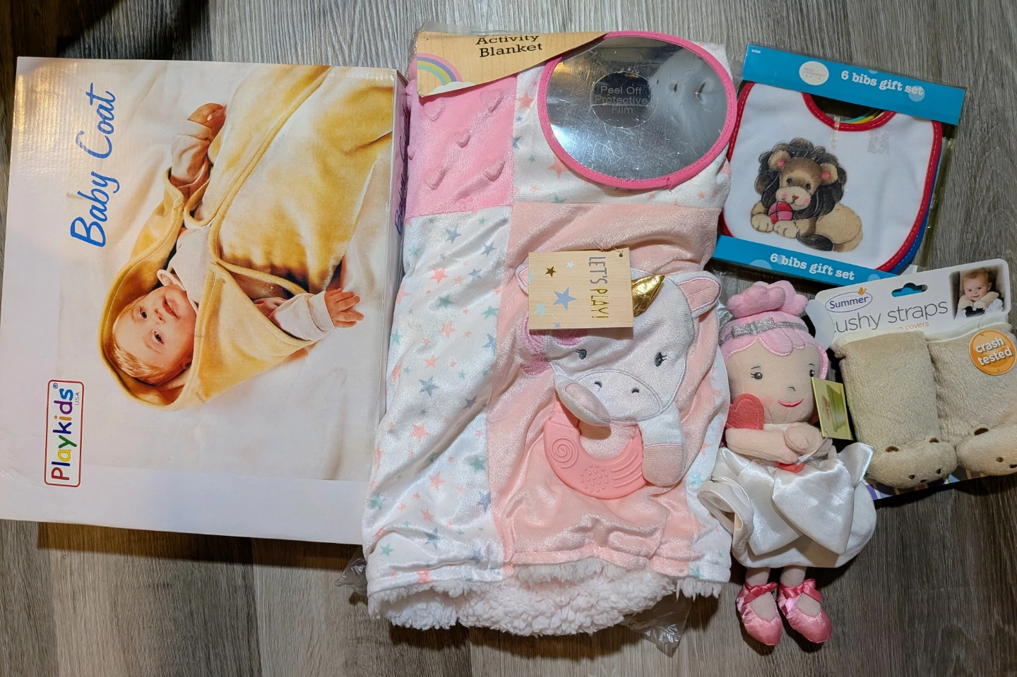 This bundle includes a Playkids baby coat, a 'Let's Play!' unicorn activity blanket with a mirror, a 6-bib gift set featuring a lion, a plush ballerina toy, and Summer brand cushy straps. The activity blanket has a built-in teether. All items are new and in packaging or box.
