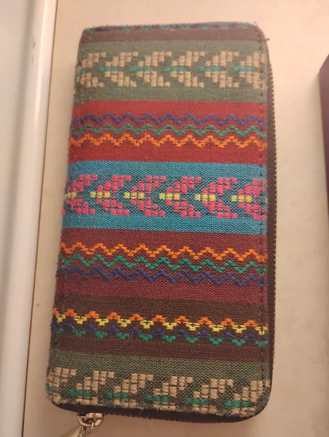 This wallet features a vibrant, woven design with horizontal stripes and geometric patterns. It zips closed and has multiple interior compartments for organization. Fabric exterior.